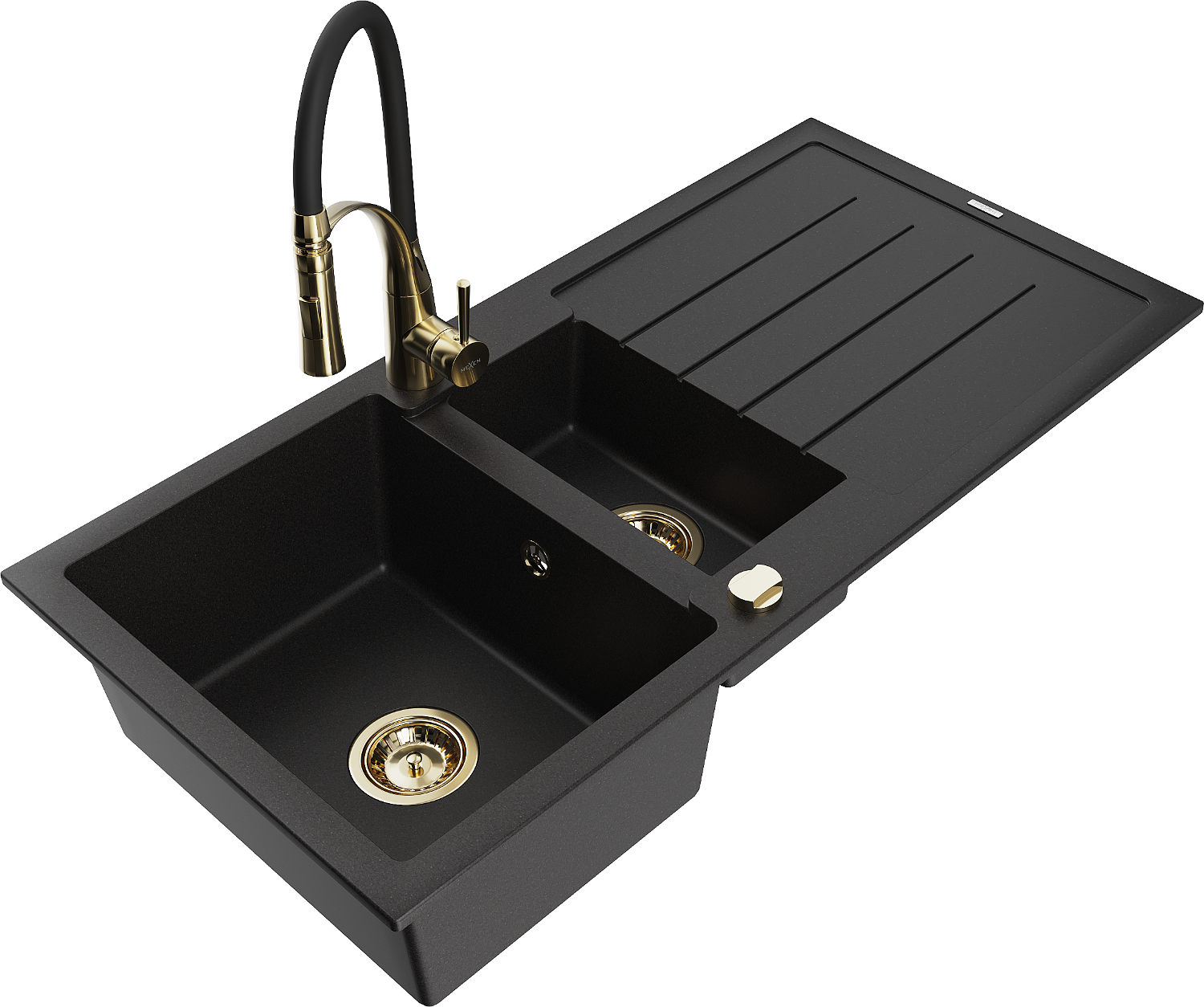 Mexen Andres granitizlietne ar 1,5 nodalījumiem, ar notecinātāju un virtuves jaucējkrānu Aster, melns - 6515-77-73450-57-G