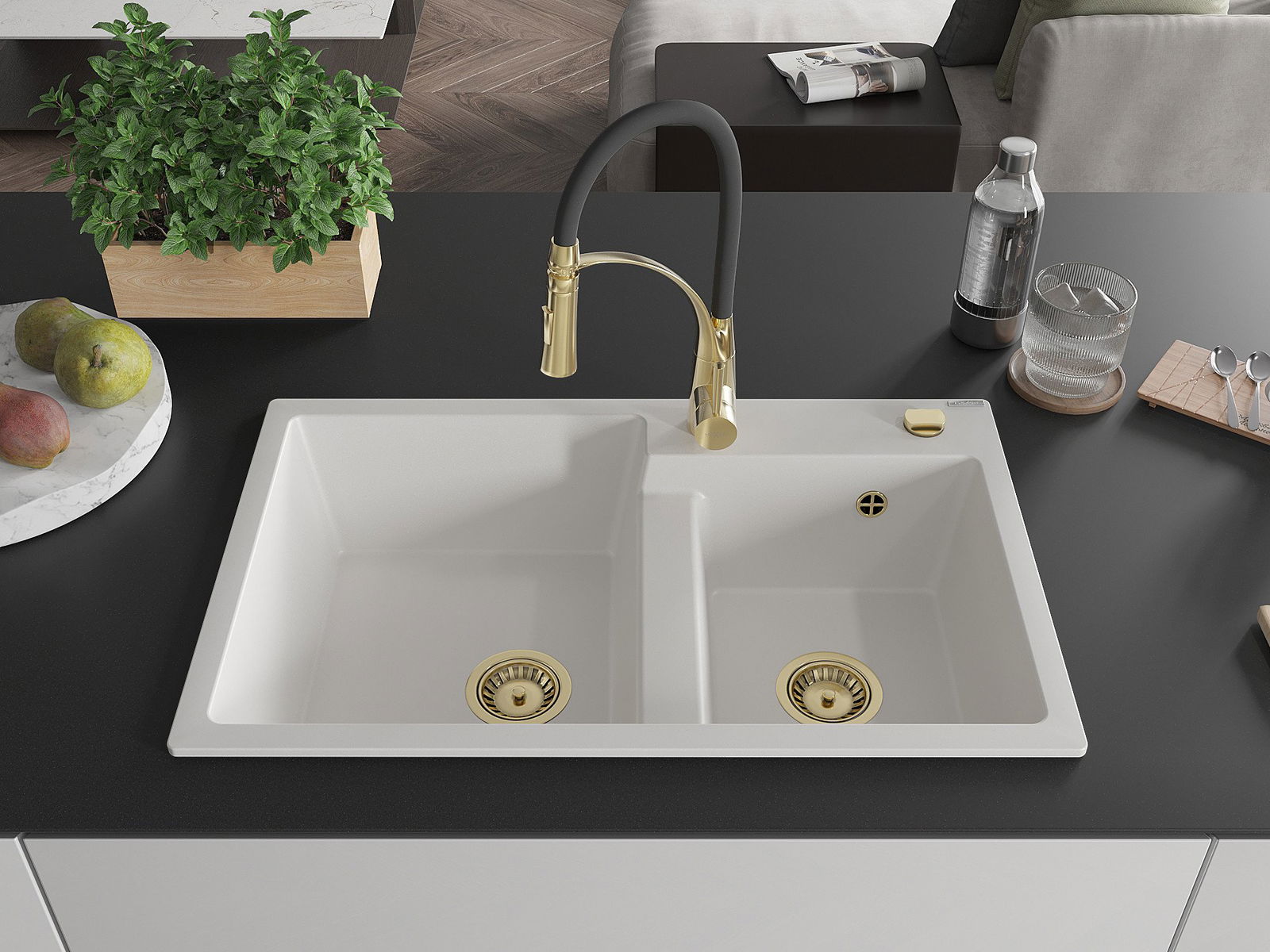 Mexen Tomas granit izlietne ar 2 nodalījumiem un virtuves jaucējkrānu Aster, balta - 6516-20-73450-57-G