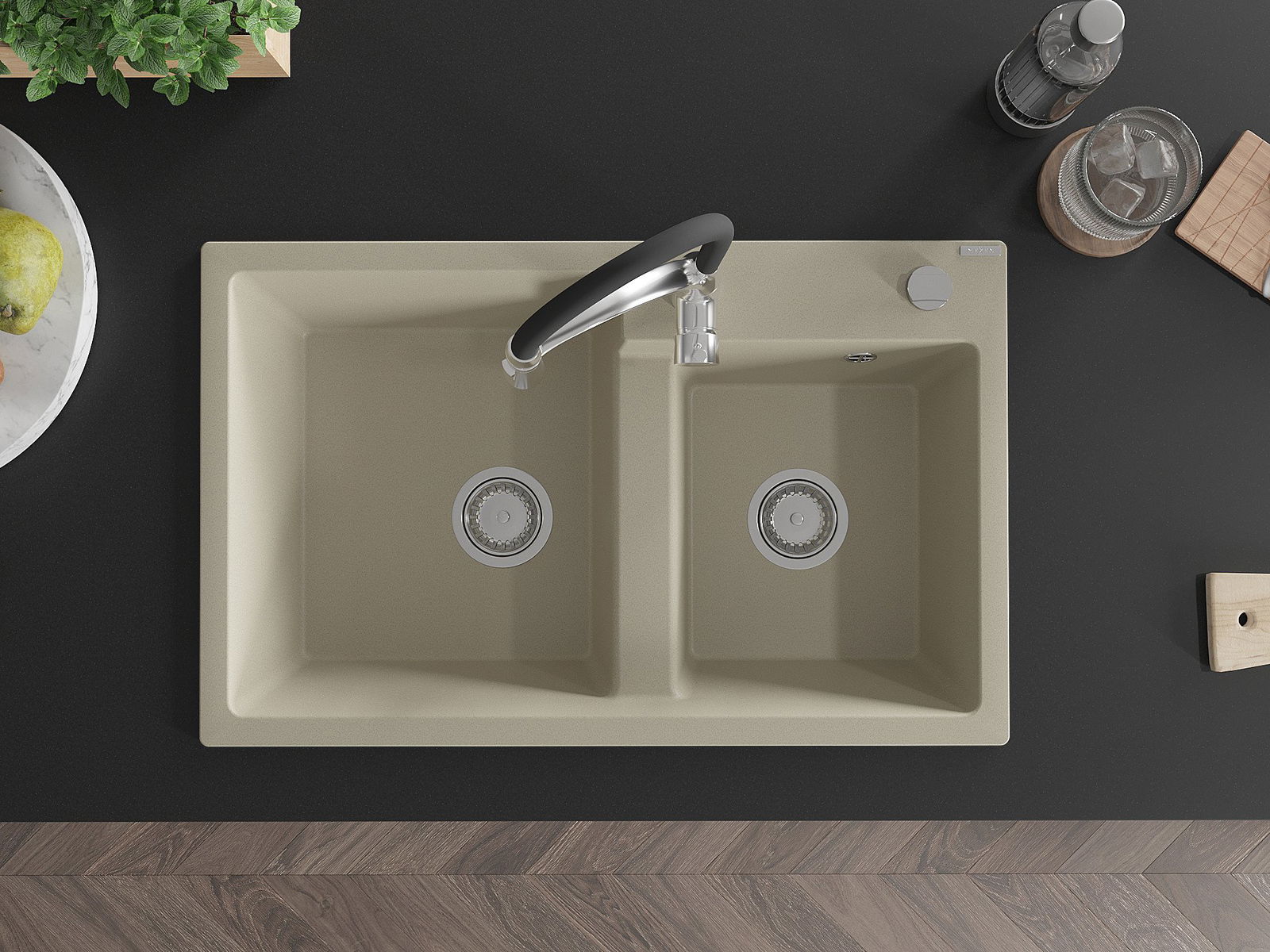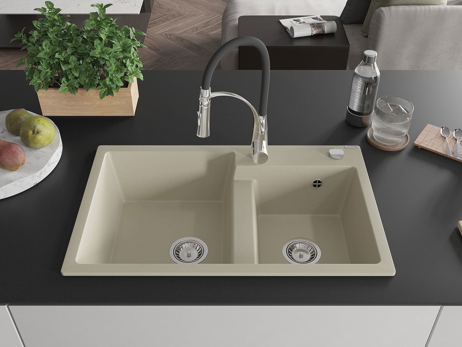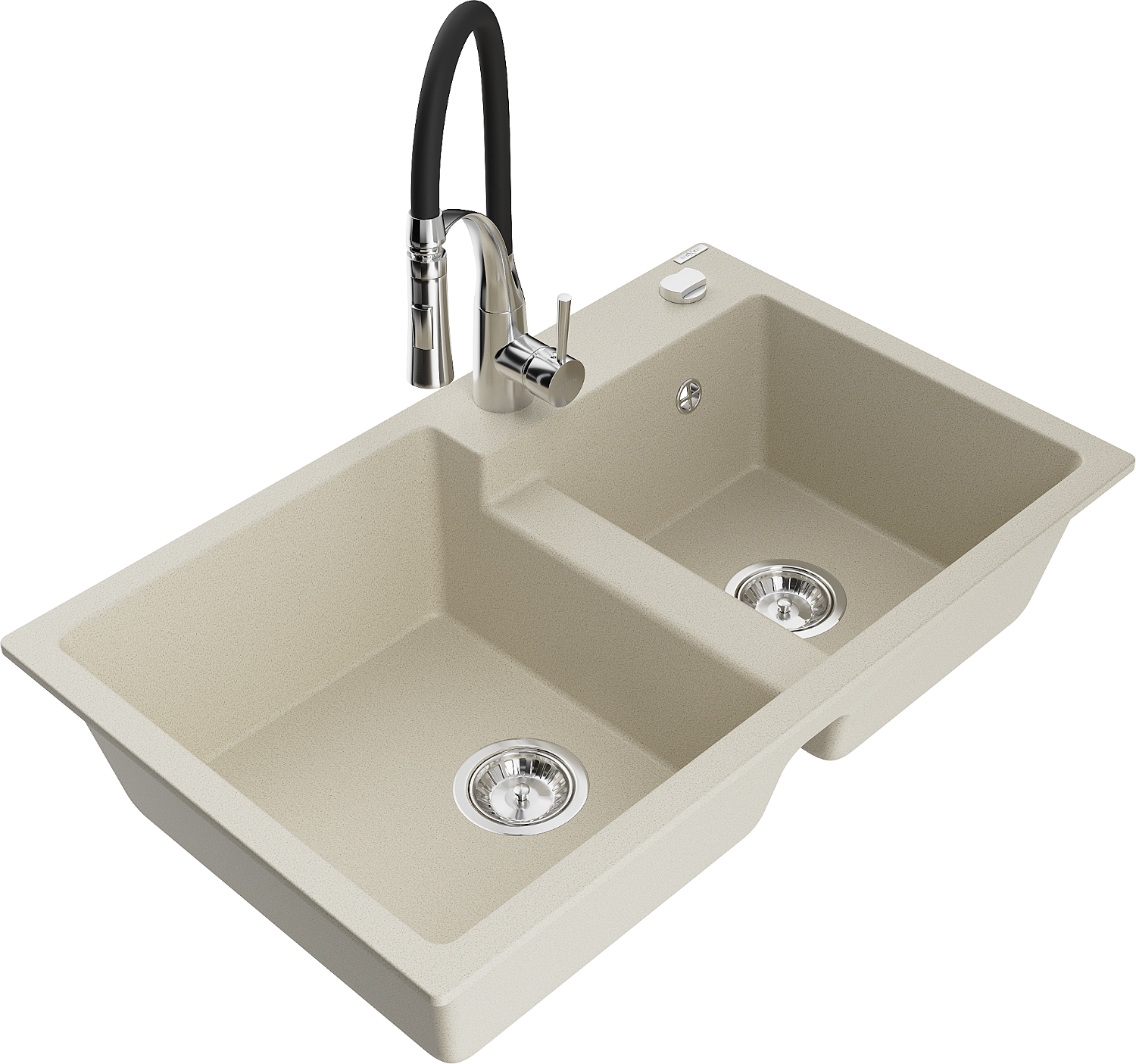 Mexen Tomas granitā izlietne ar divām nodalījumiem un virtuves krānu Aster, bēšs - 6516-69-73450-07