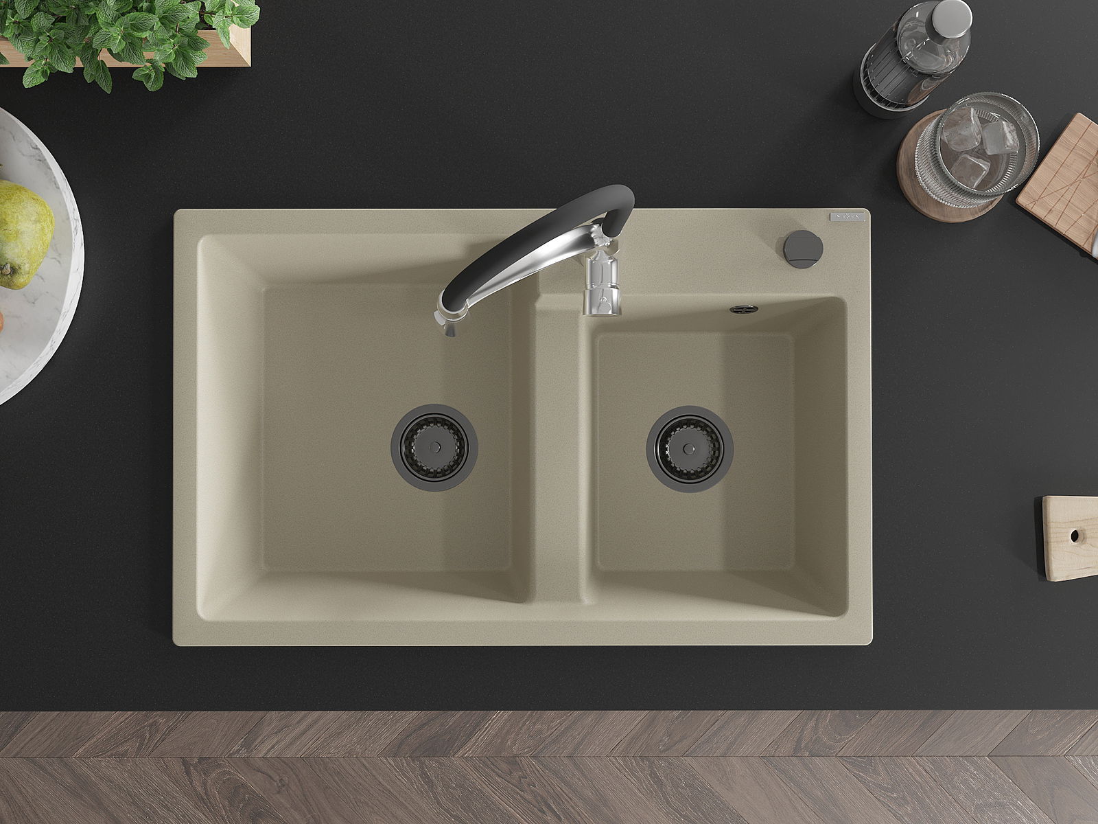 Mexen Tomas divpadsmitāria divdaļīgs granīta izlietne ar virtuves jaucējkrānu Aster, bēša - 6516-69-73450-07-B
