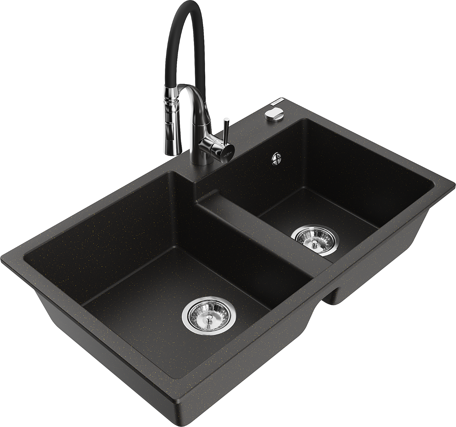 Mexen Tomas granitē izlietne ar 2 nodalījumiem un virtuves bateriju Aster, melna/zeltaina metālika - 6516-75-73450-07
