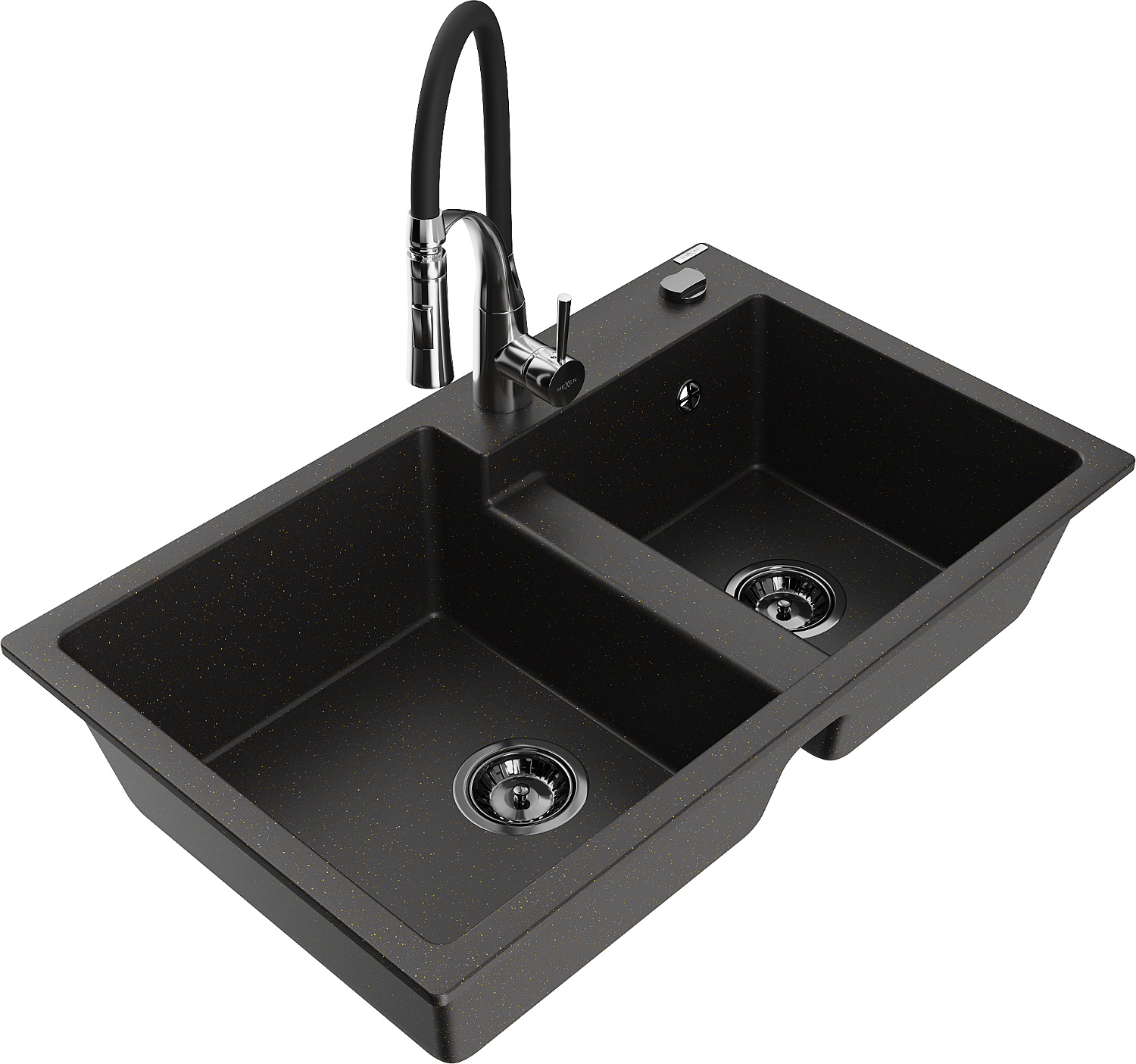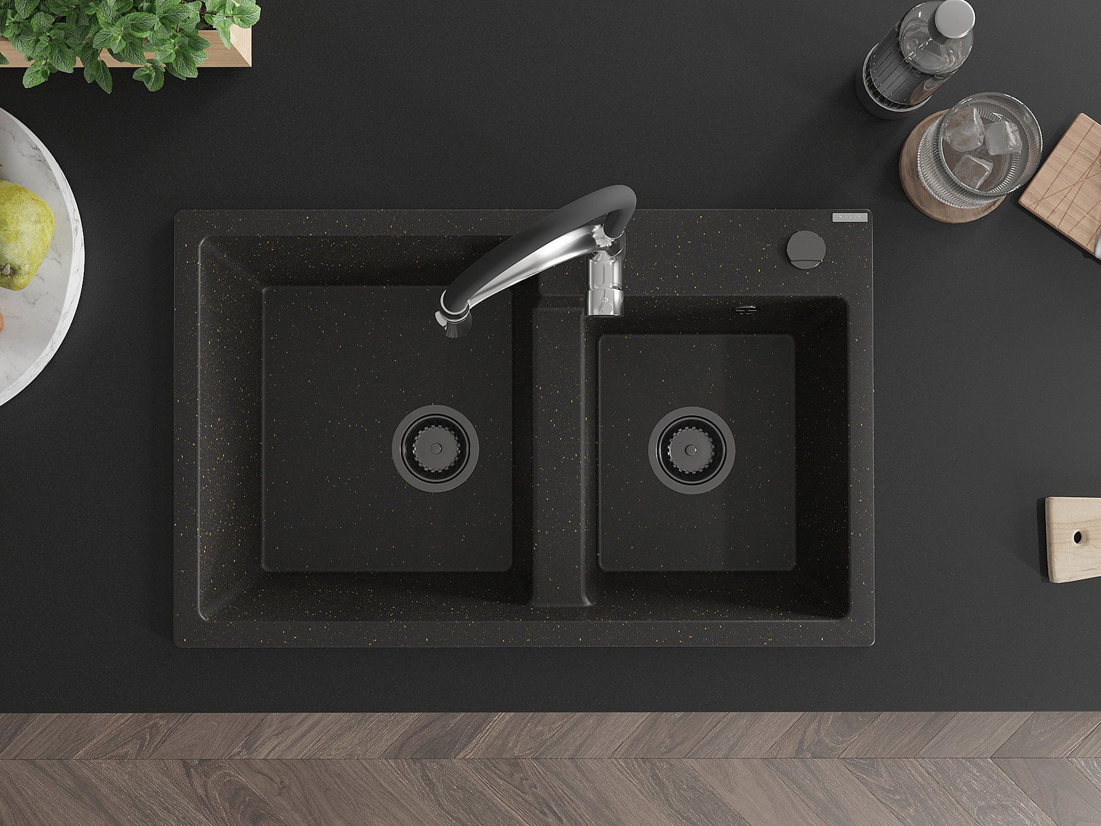 Mexen Tomas granitizlietne ar divām nodalījumiem un virtuves jaucējkrānu Aster, melns/zelta metālisks - 6516-75-73450-07-B