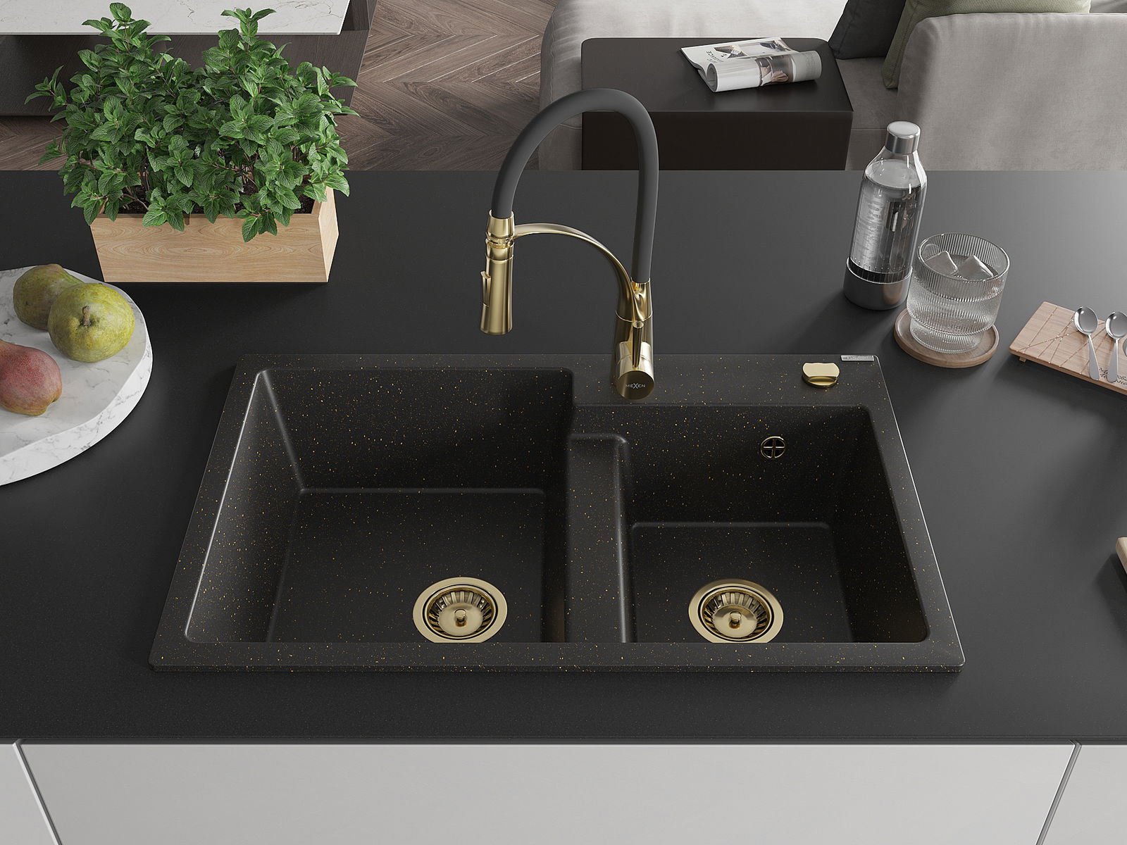 Mexen Tomas grants izlietne ar 2 nodalījumiem un virtuves jaucējkrānu Aster, melns/zeltā metālisks - 6516-75-73450-57-G