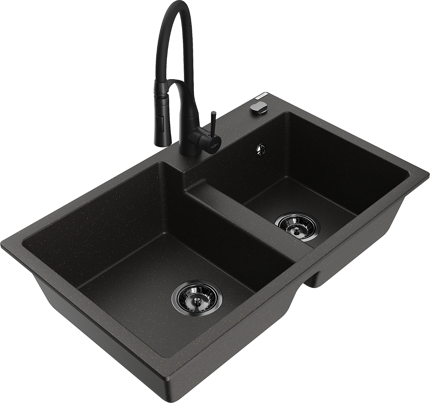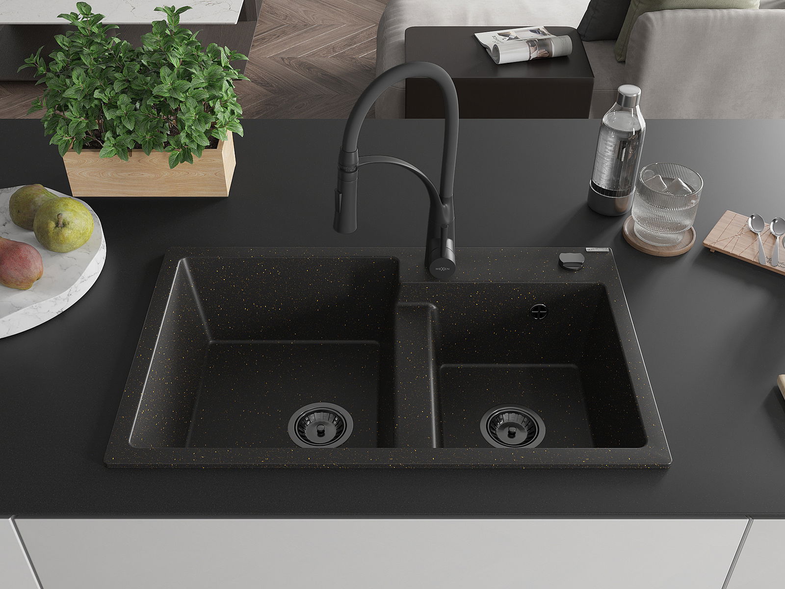Mexen Tomas granitē izlietne ar 2 nodalījumiem un virtuves jaucējkrānu Aster, melns/zeltīts metālisks - 6516-75-73450-70-B