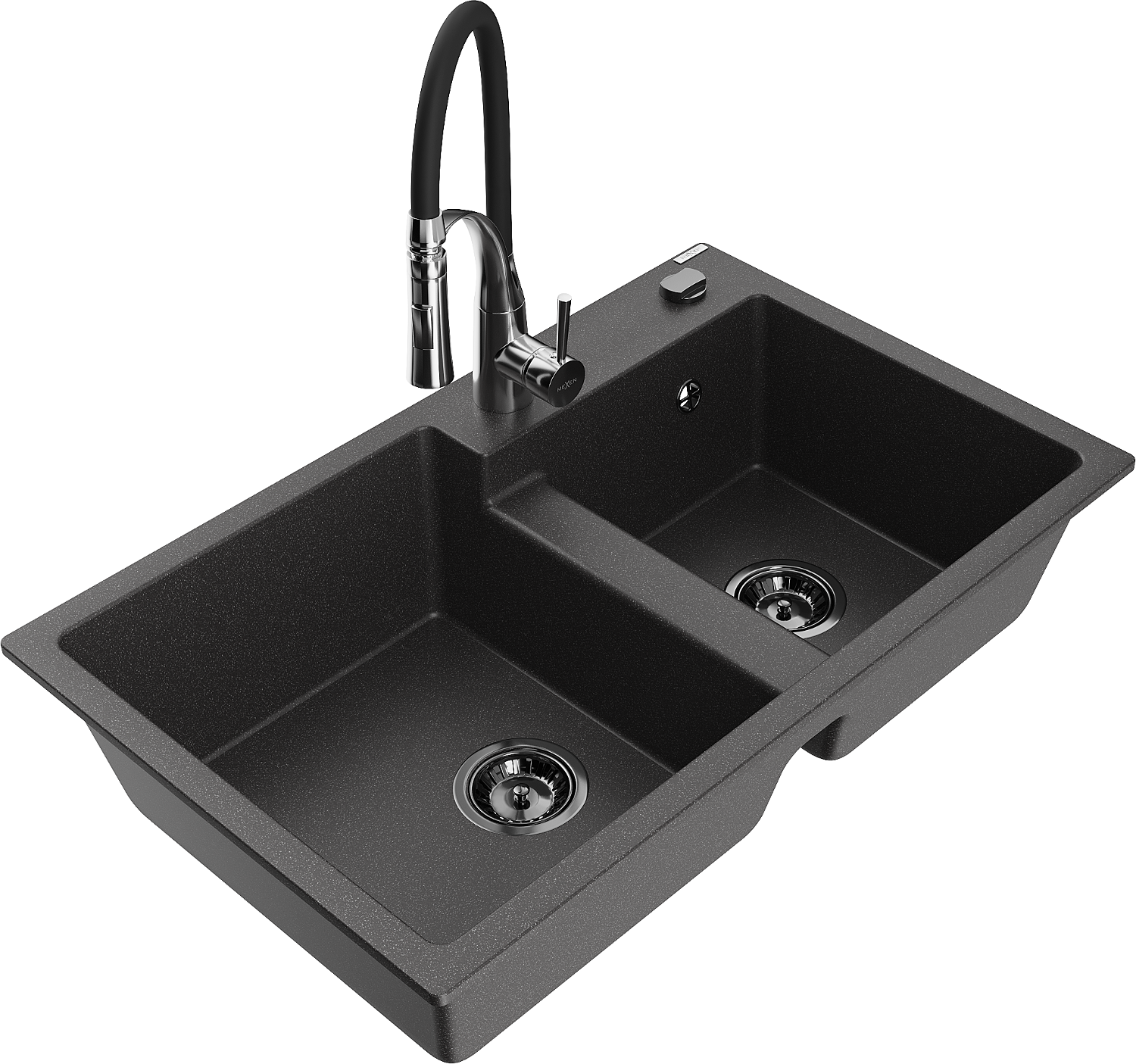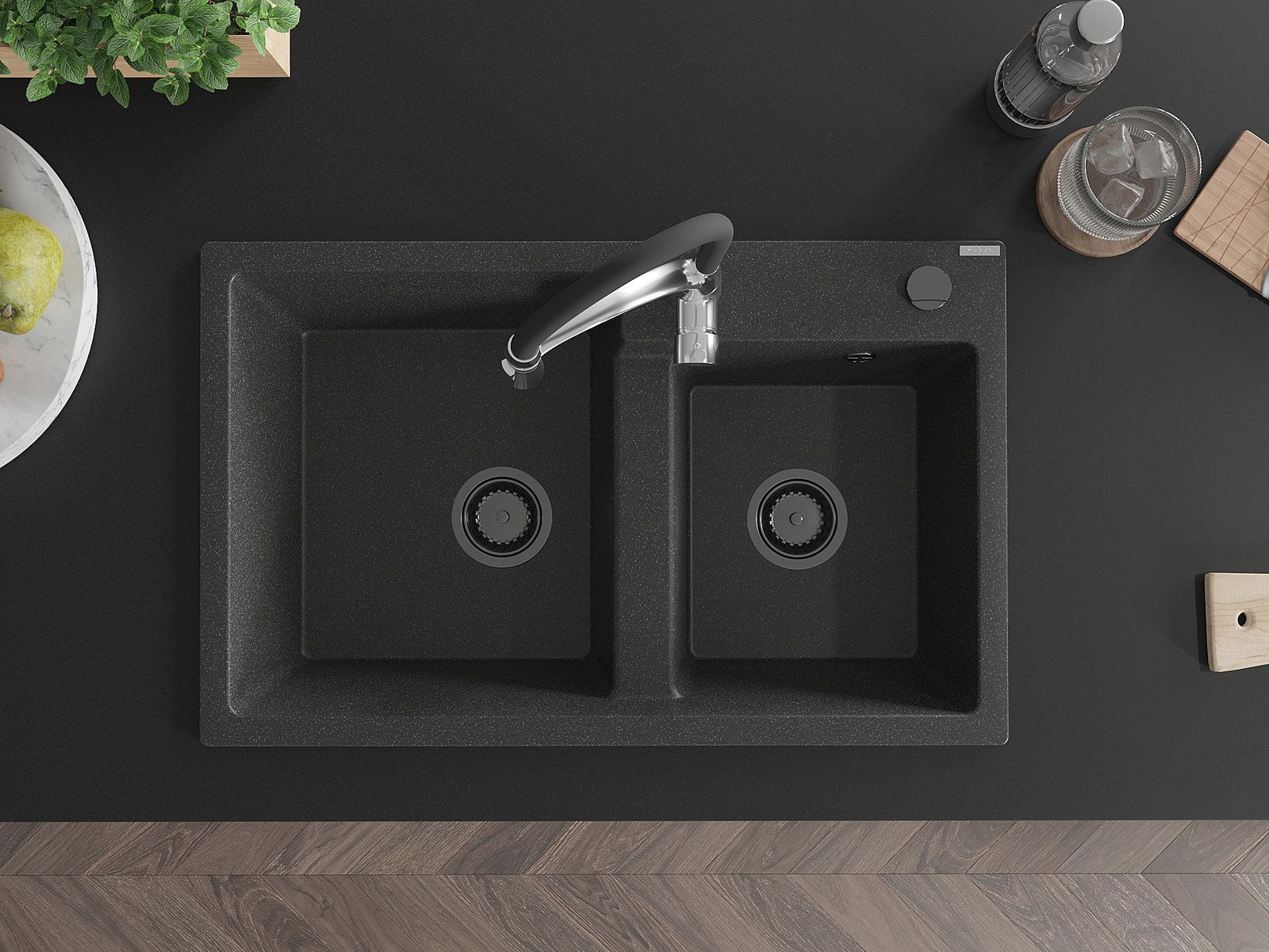 Mexen Tomas granit izlietne ar divām nodalījumiem un virtuves jaucējkrānu Aster, melna ar pārkārniem - 6516-76-73450-07-B