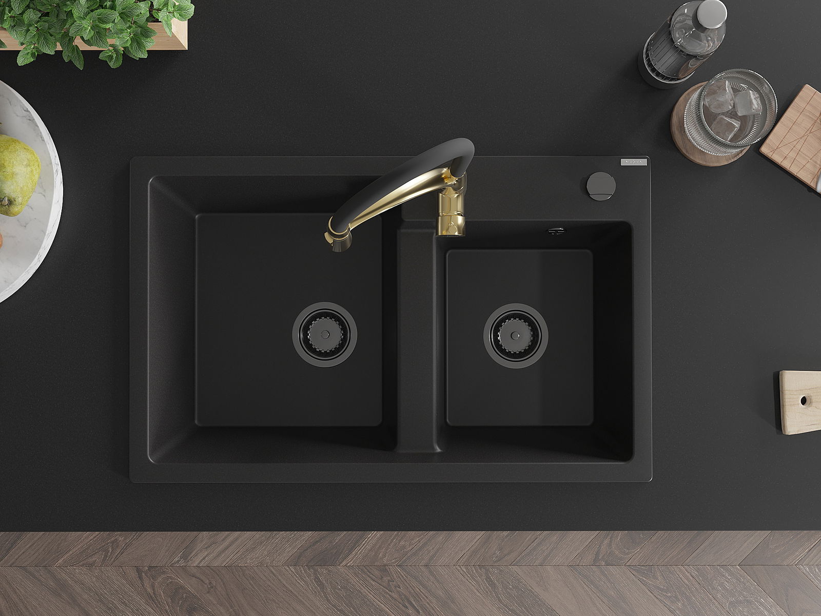 Mexen Tomas granitā izlietne ar divām kamerām un virtuves krānu Aster, melna - 6516-77-73450-57-B