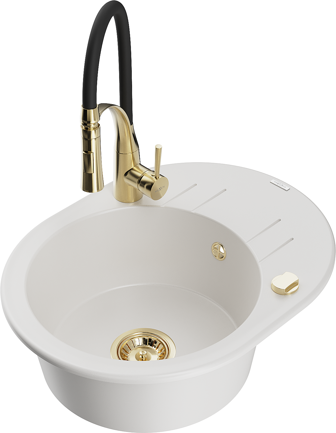 Mexen Kevin granitā izlietne ar 1 nodalījumu un noteces pannu un virtuves jaucējkrānu Aster, balta - 6517-20-73450-57-G