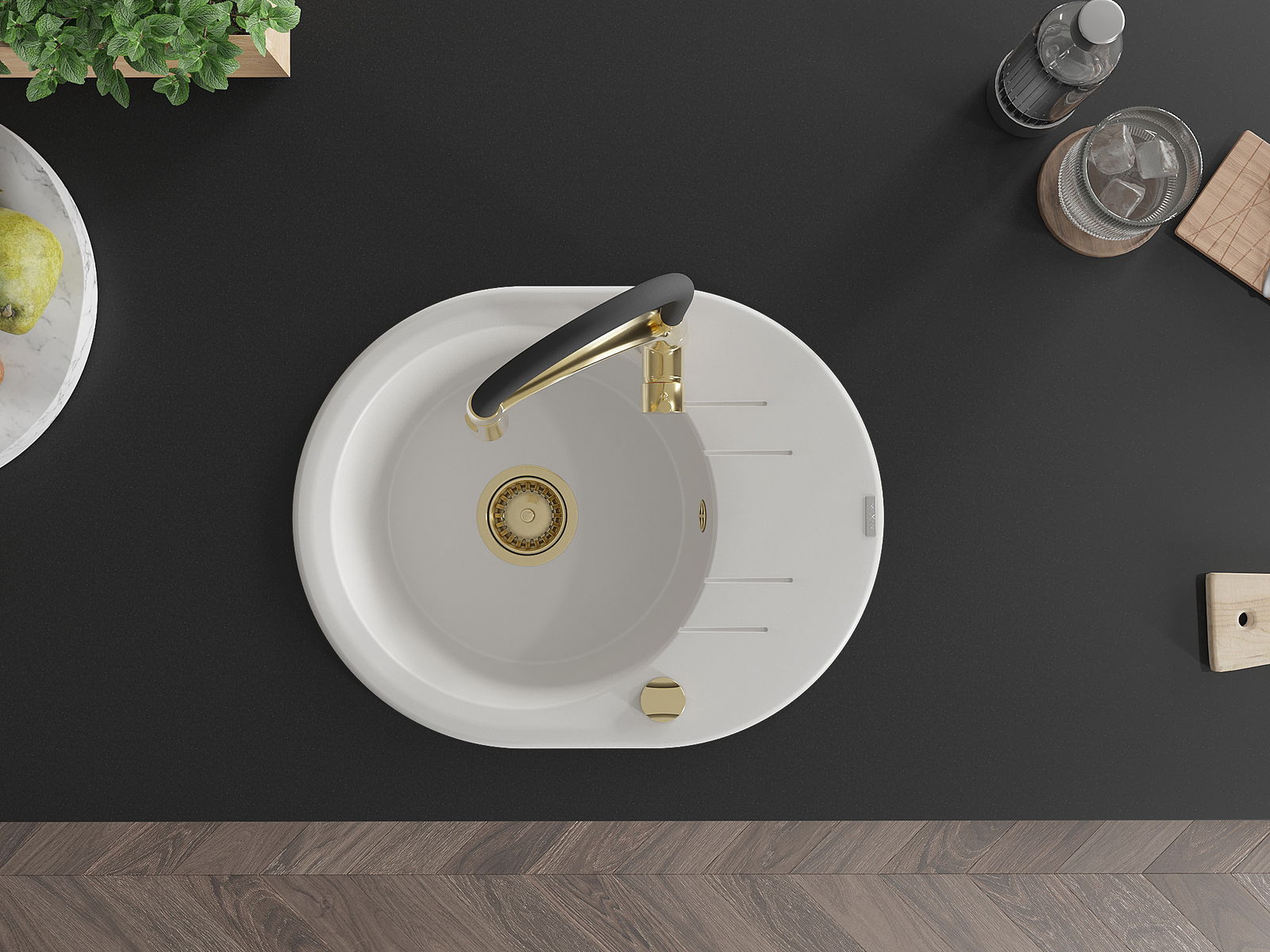 Izlietnei ir 2 daļēji izurbtas atveres ar diametru 35 mm, kuras var pašrocīgi izsist. Tās var izmantot, piemēram, šķidruma dozatora uzstādīšanai, kas novērsīs plastmasas pudeļu klātbūtni virtuvē un piešķirs tai elegantu apdari.