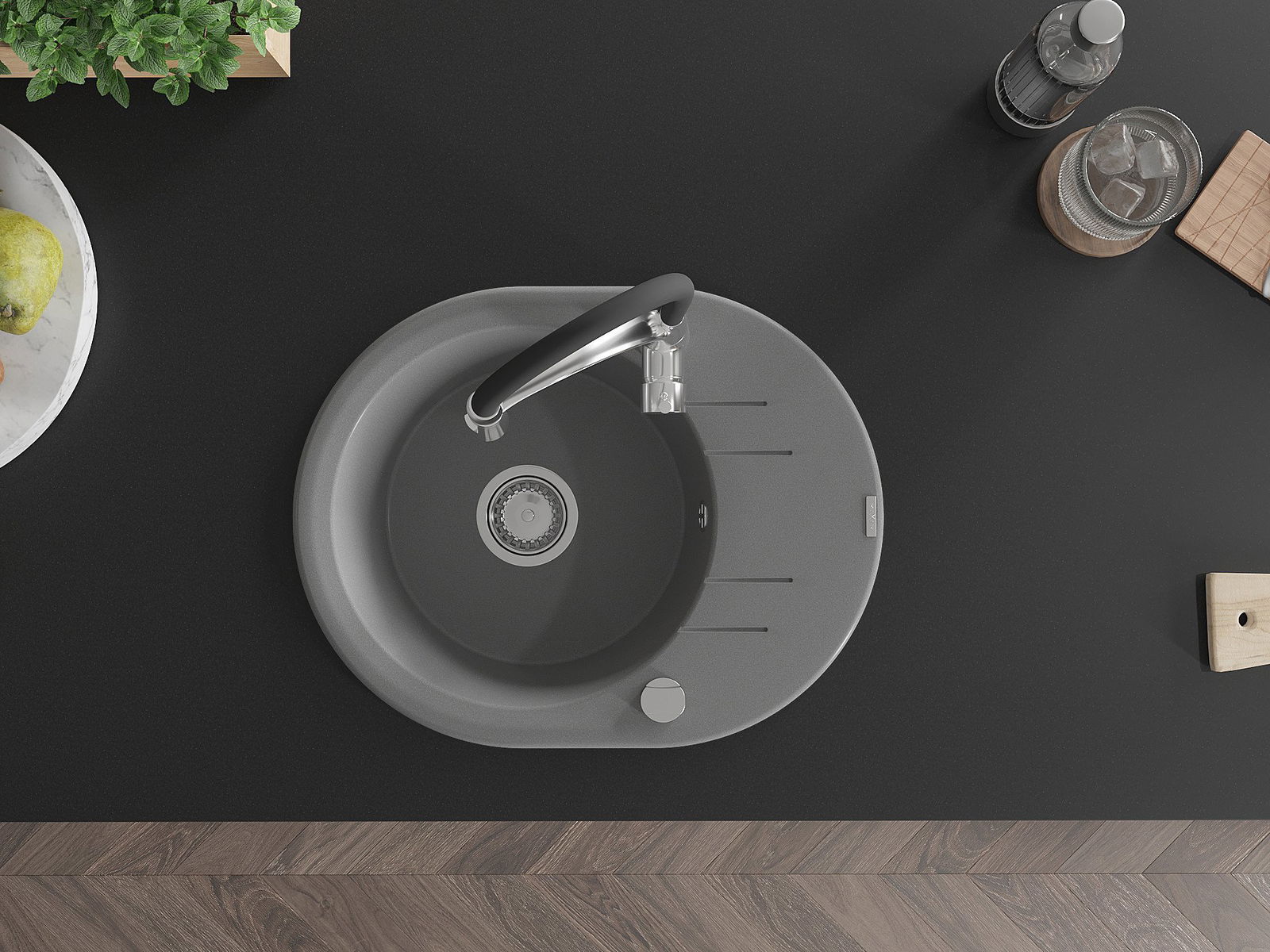 Mexen Kevin granitē izlietne ar 1 nodalījumu, notekas paneli un virtuves krānu Aster, pelēka - 6517-71-73450-07