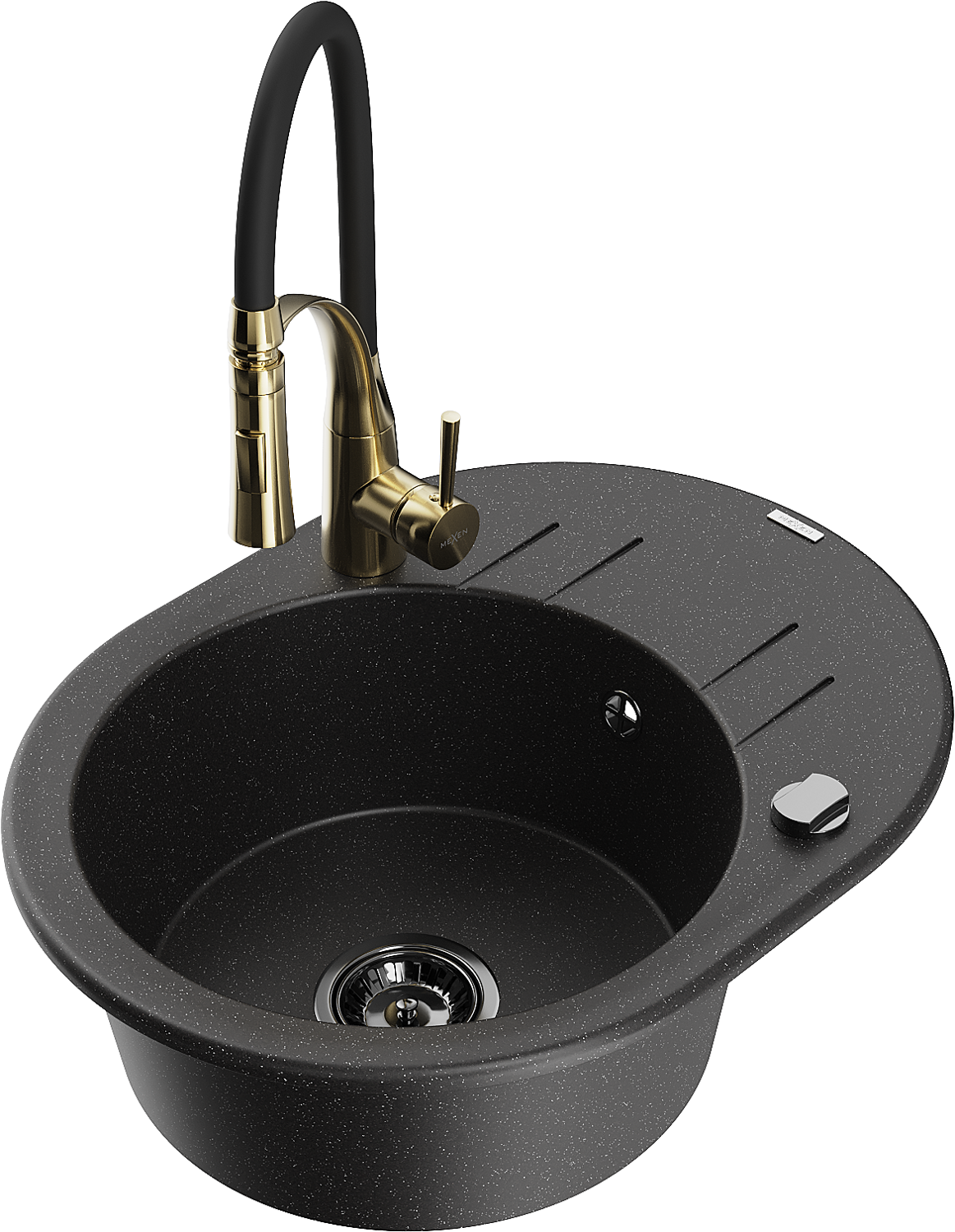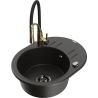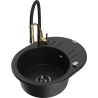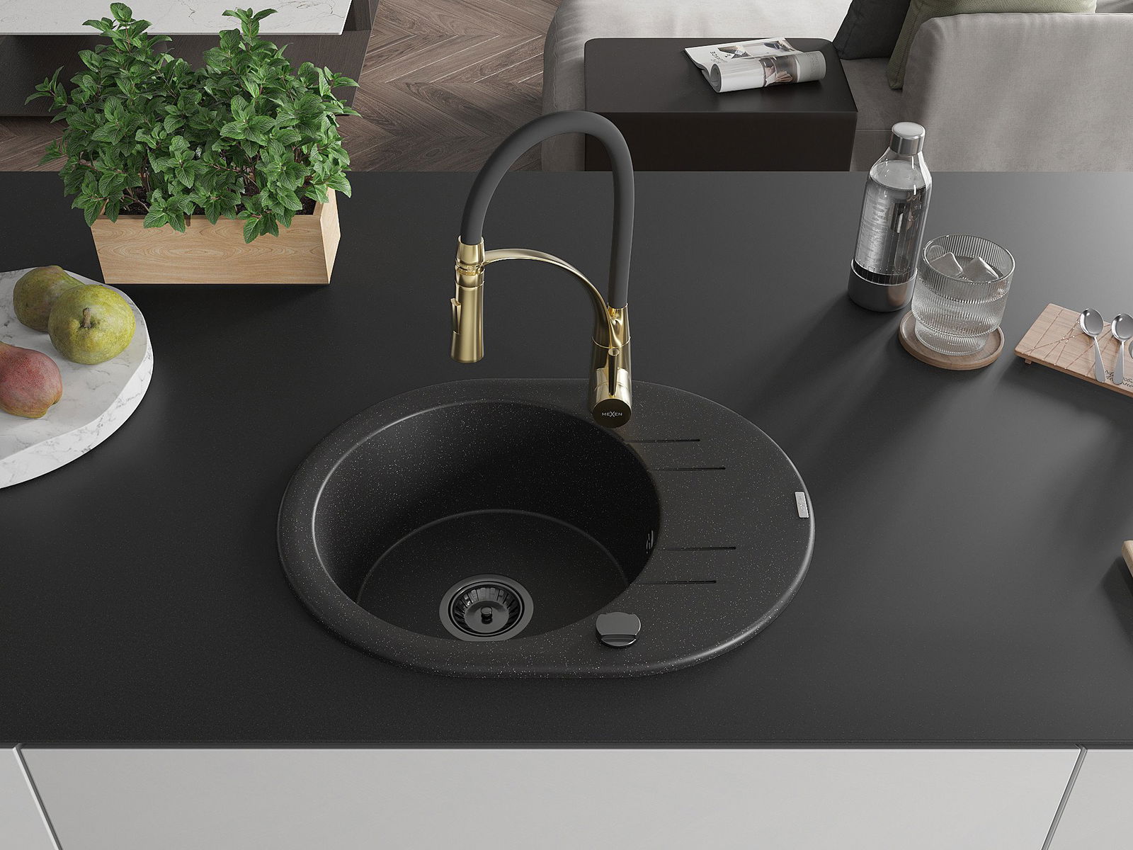 Mexen Kevin granitizlietne viena nodalījuma ar noteces vietu un virtuves jaucējkrānu Aster, melns/sudraba metāliska krāsa