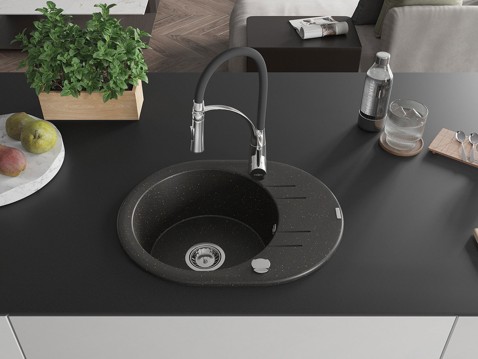 Mexen Kevin granīta izlietne ar vienu sekciju ar noteces paneli un virtuves jaucējkrānu Aster, melna/zeltīta metālika