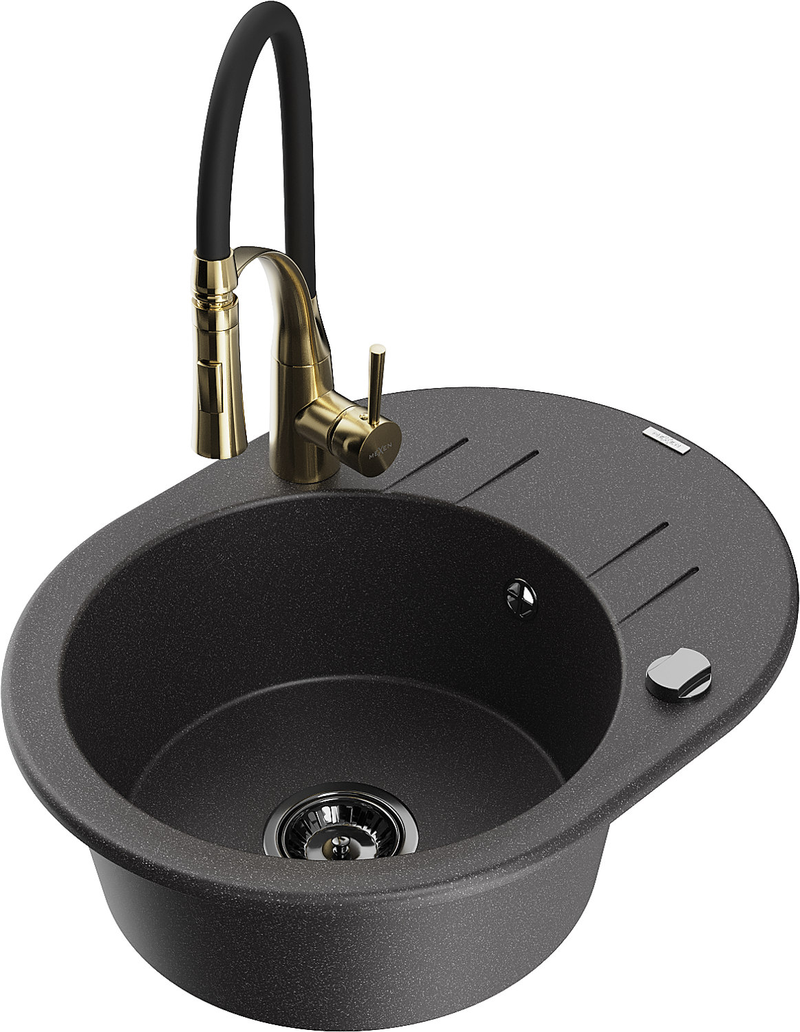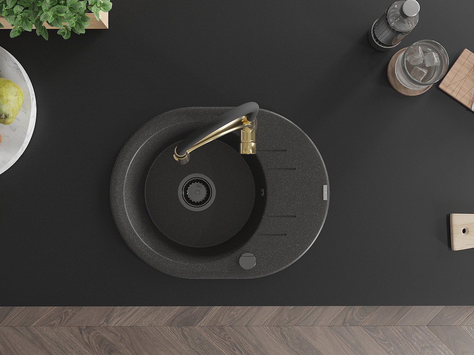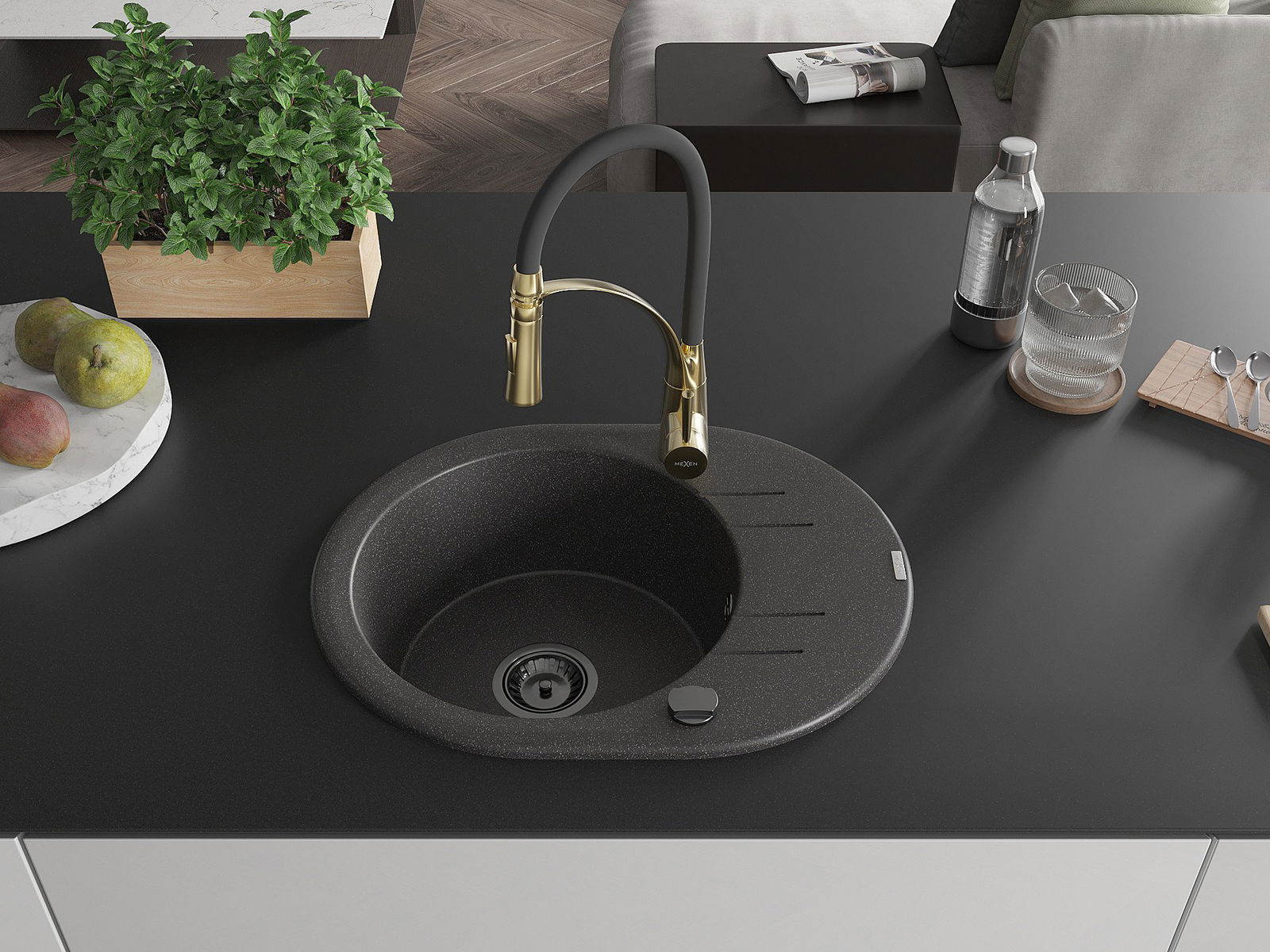 Mexen Kevin 1-kameru granīta izlietne ar noteces virsmu un virtuves jaucējkrānu Aster, melna ar raibumiem - 6517-76-73450-57-B