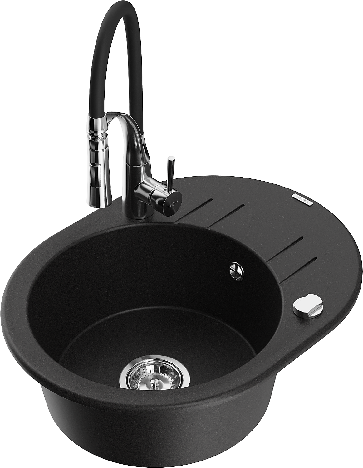 Mexen Kevin granitā izlietne 1-kameru ar noteci un virtuves krānu Aster, melna - 6517-77-73450-07