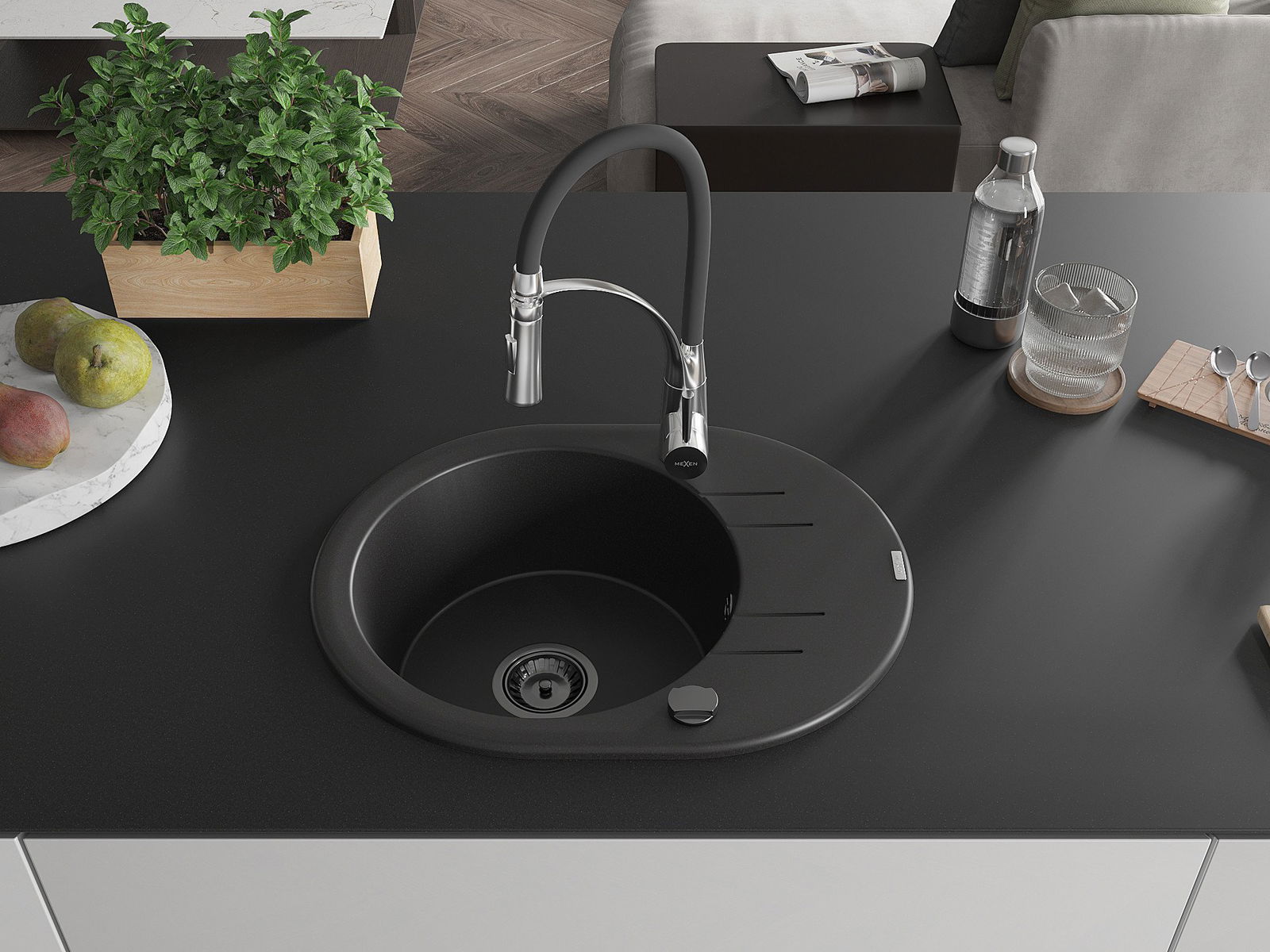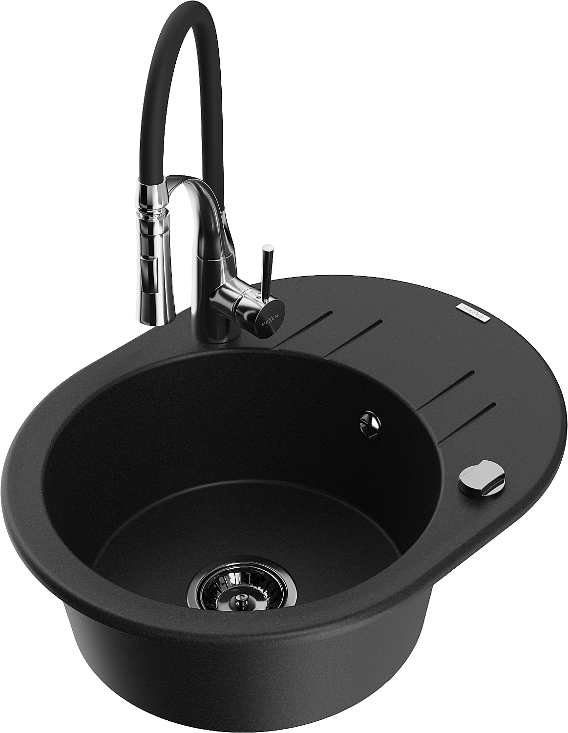 Mexen Kevin 1-kameras granīta izlietne ar noteci un virtuves jaucējkrānu Aster, melna - 6517-77-73450-07-B