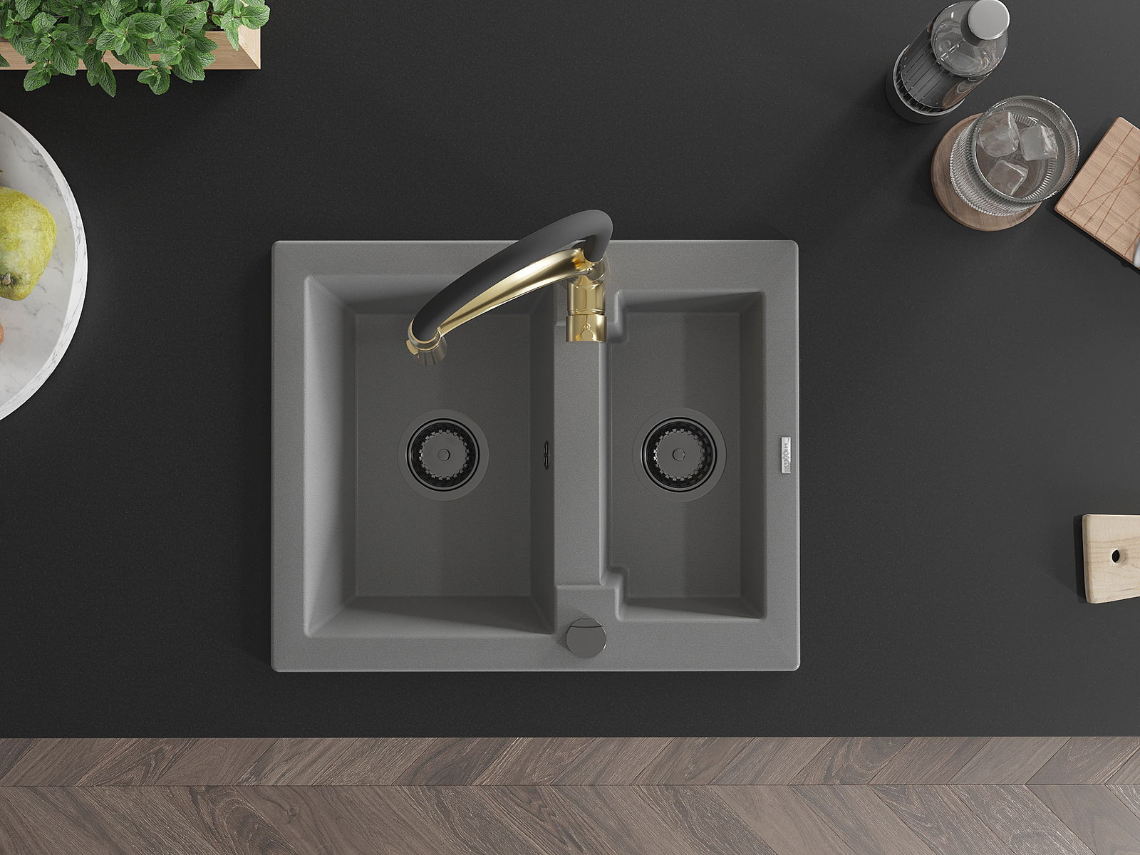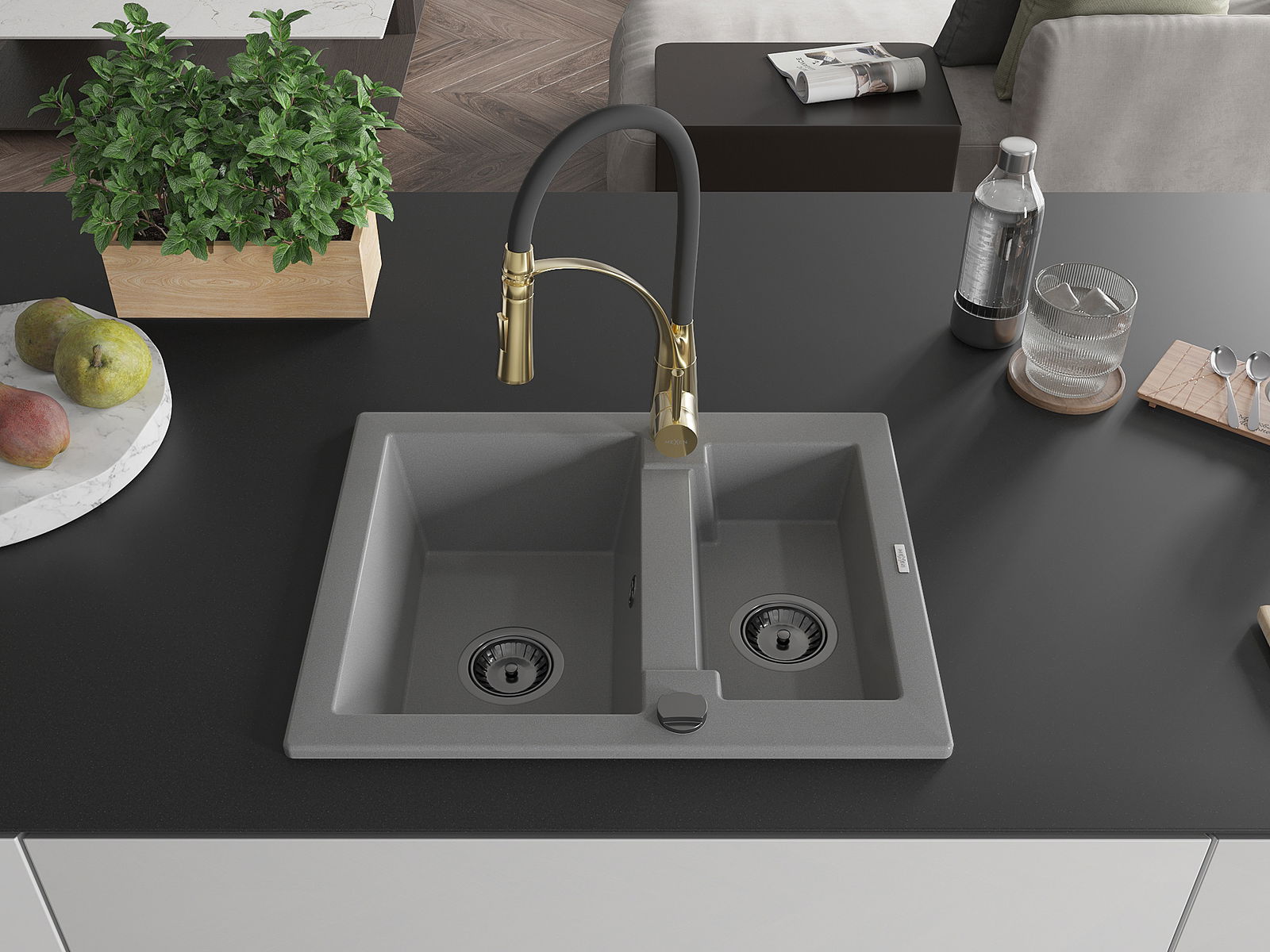 Mexen Carlos granīta izlietne ar 1,5 nodalījumiem un virtuves jaucējkrānu Aster, pelēks - 6518-71-73450-57-B