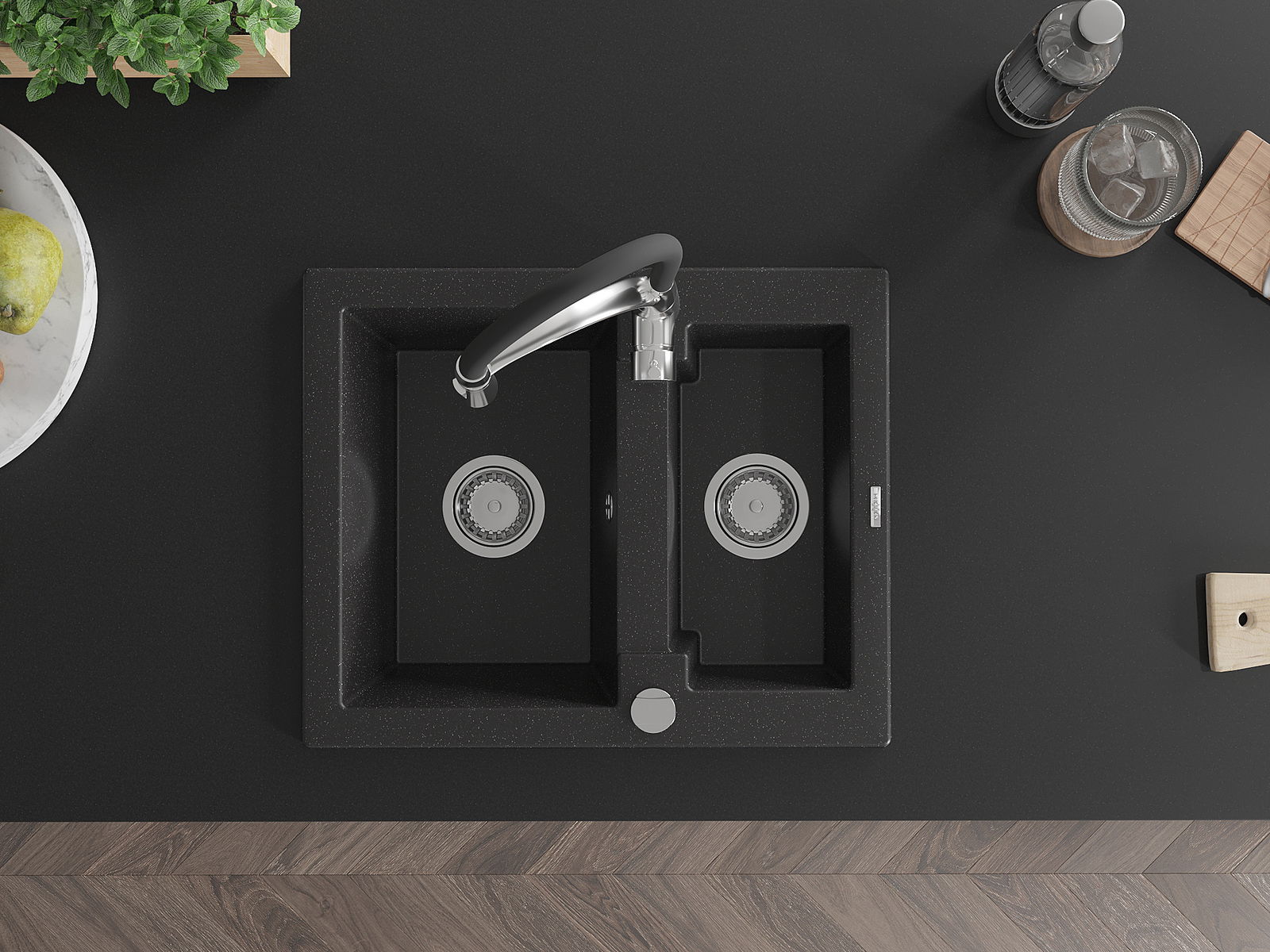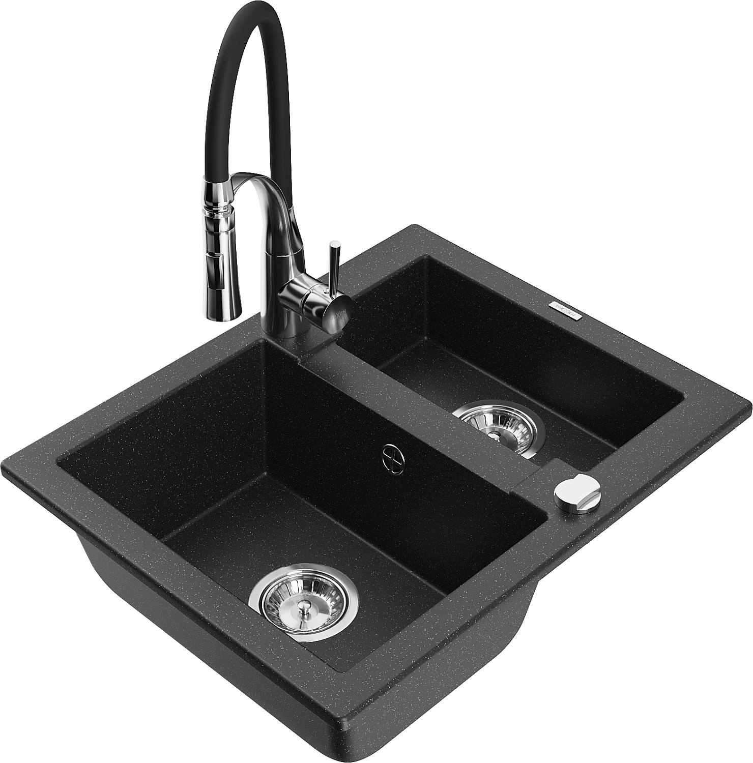 Mexen Carlos granitā izlietne 1,5 kameru ar virtuves jaucējkrānu Aster, melna/sudraba metālika - 6518-73-73450-07