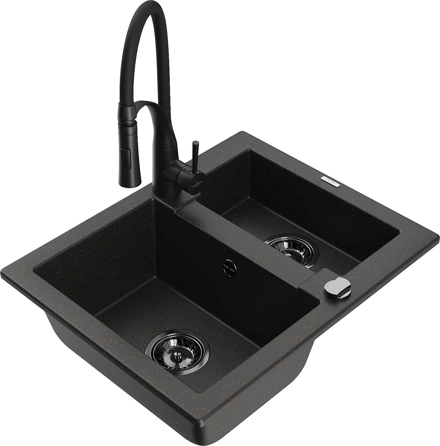 Mexen Carlos granitā izlietne ar 1,5 nodalījumiem un Aster virtuves jaucējkrānu, melna/zeltaina metāliskā - 6518-75-73450-70-B