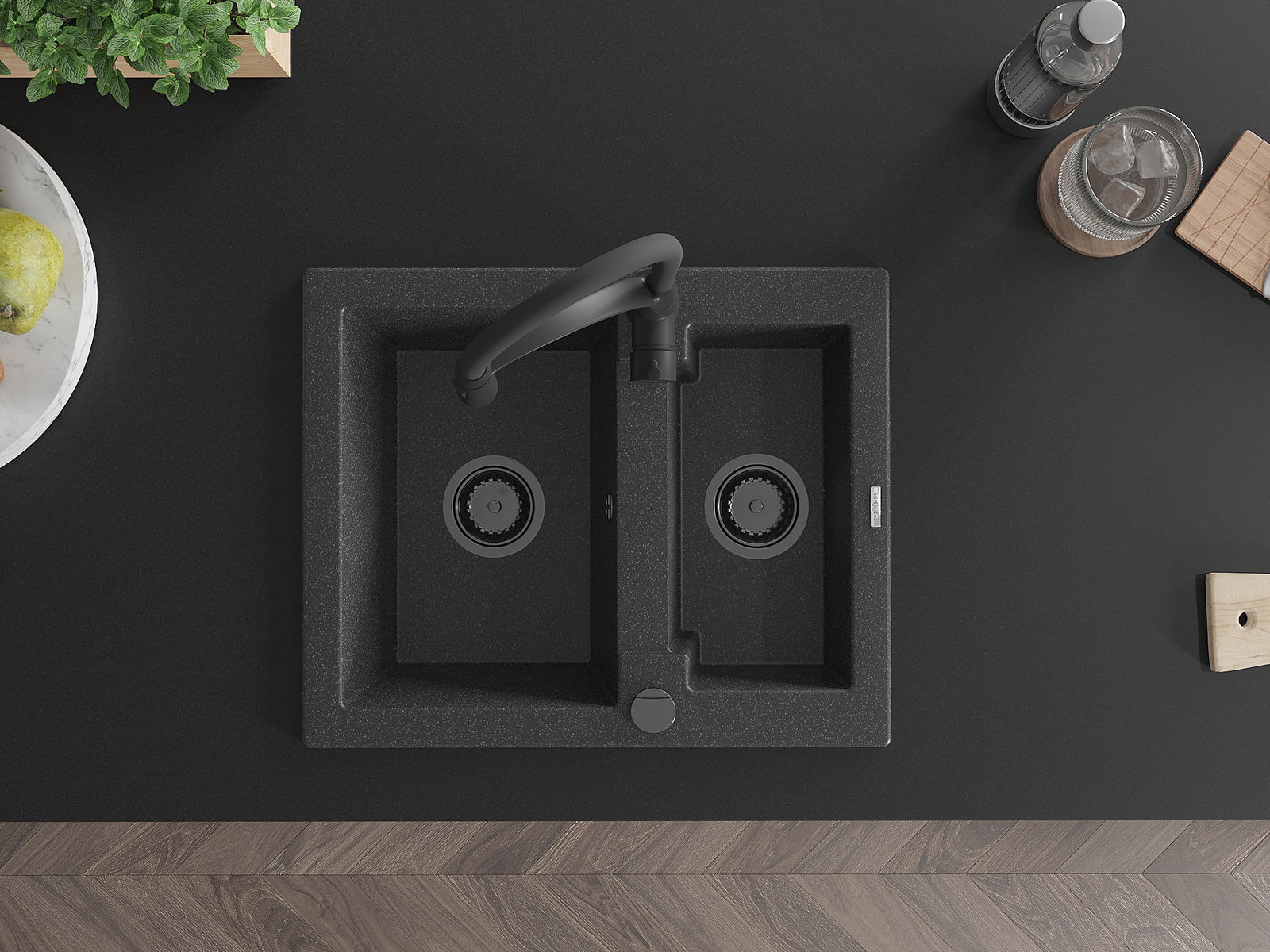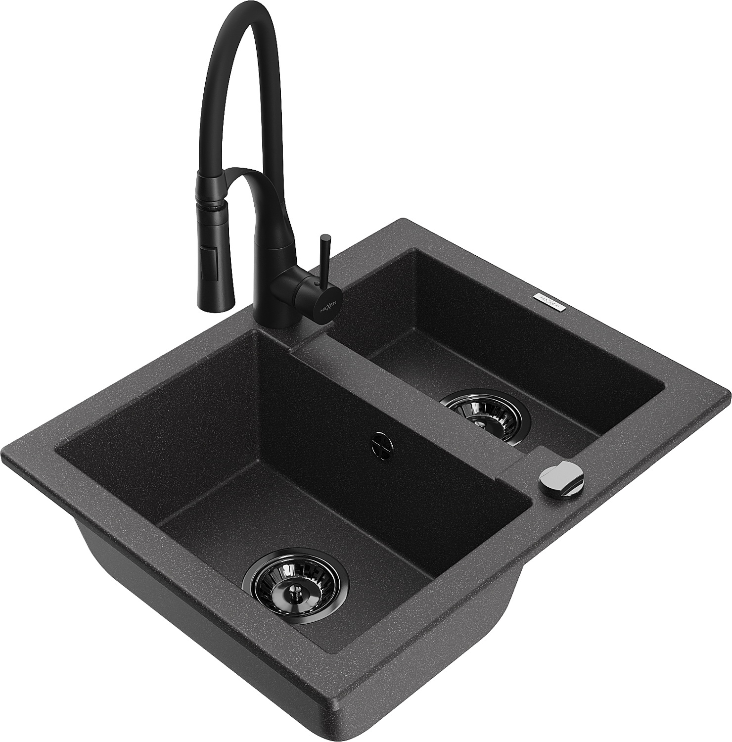 Mexen Carlos granit izlietne ar 1,5 kameru un virtuves jaucējkrānu Aster, melna ar plankumiem - 6518-76-73450-70-B