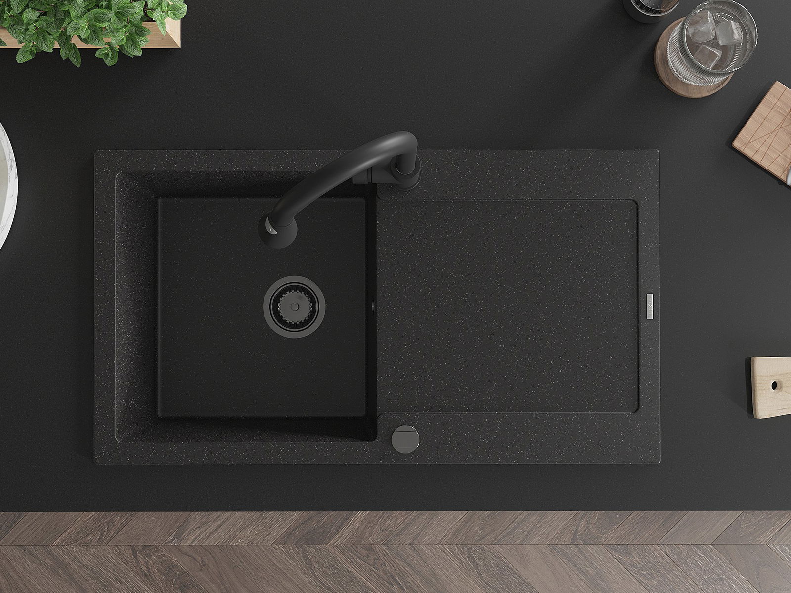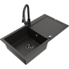 Mexen Leo granit izlietne ar vienu nodalījumu un nosūcēju, ar virtuves jaucējkrānu Elia, melna/sudraba metālika