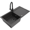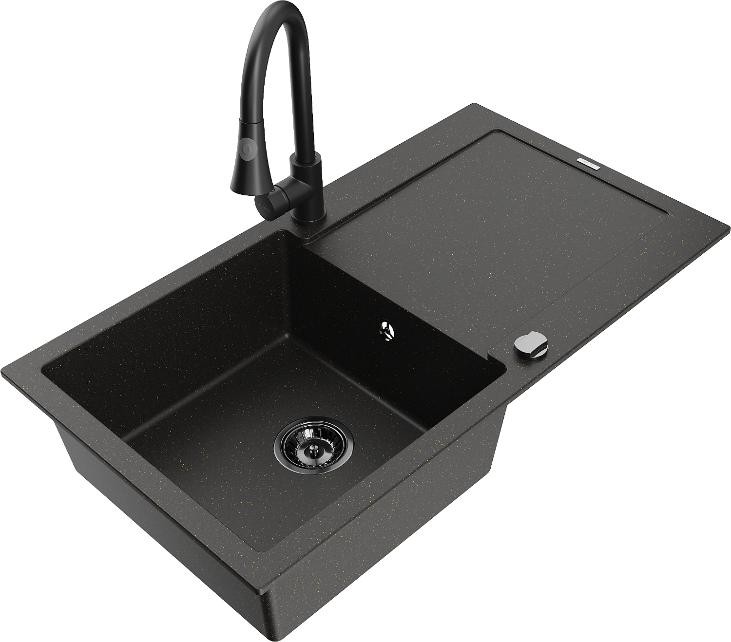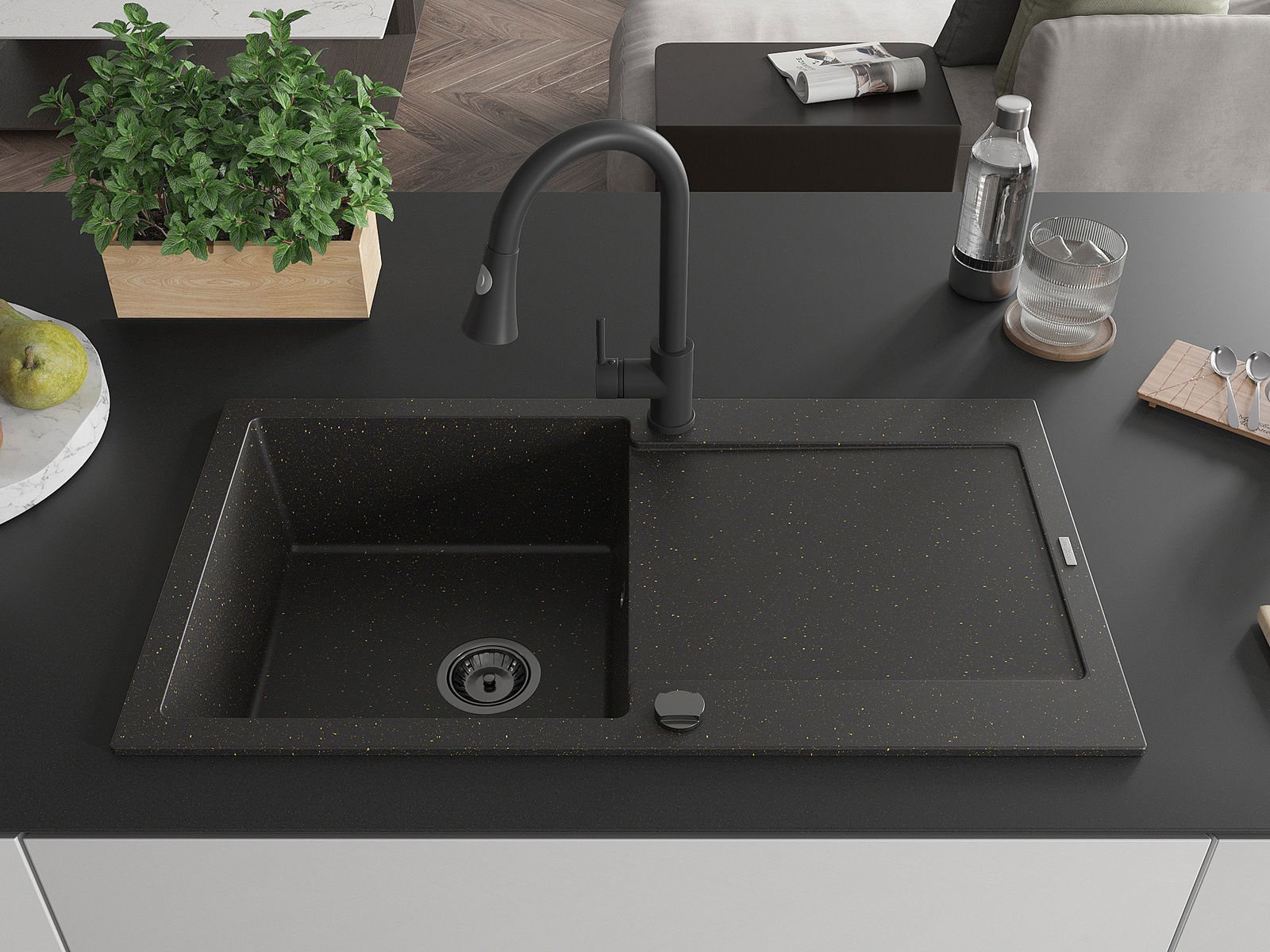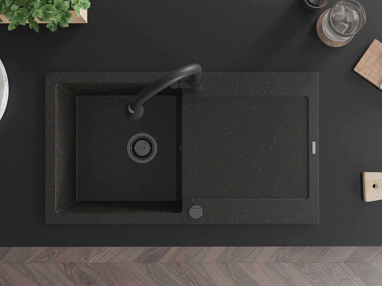 Mexen Leo granīta izlietne ar vienu nodalījumu ar noteci un virtuves jaucējkrānu Elia, melna/zeltīta metālika