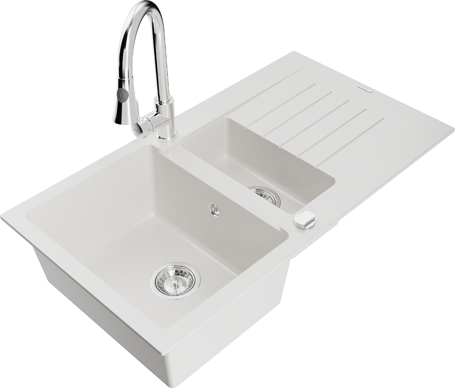 Mexen Matias granitā izlietne ar 1,5 nodalījumu, novadni un virtuves jaucējkrānu Elia, balta - 6502-20-670101-00