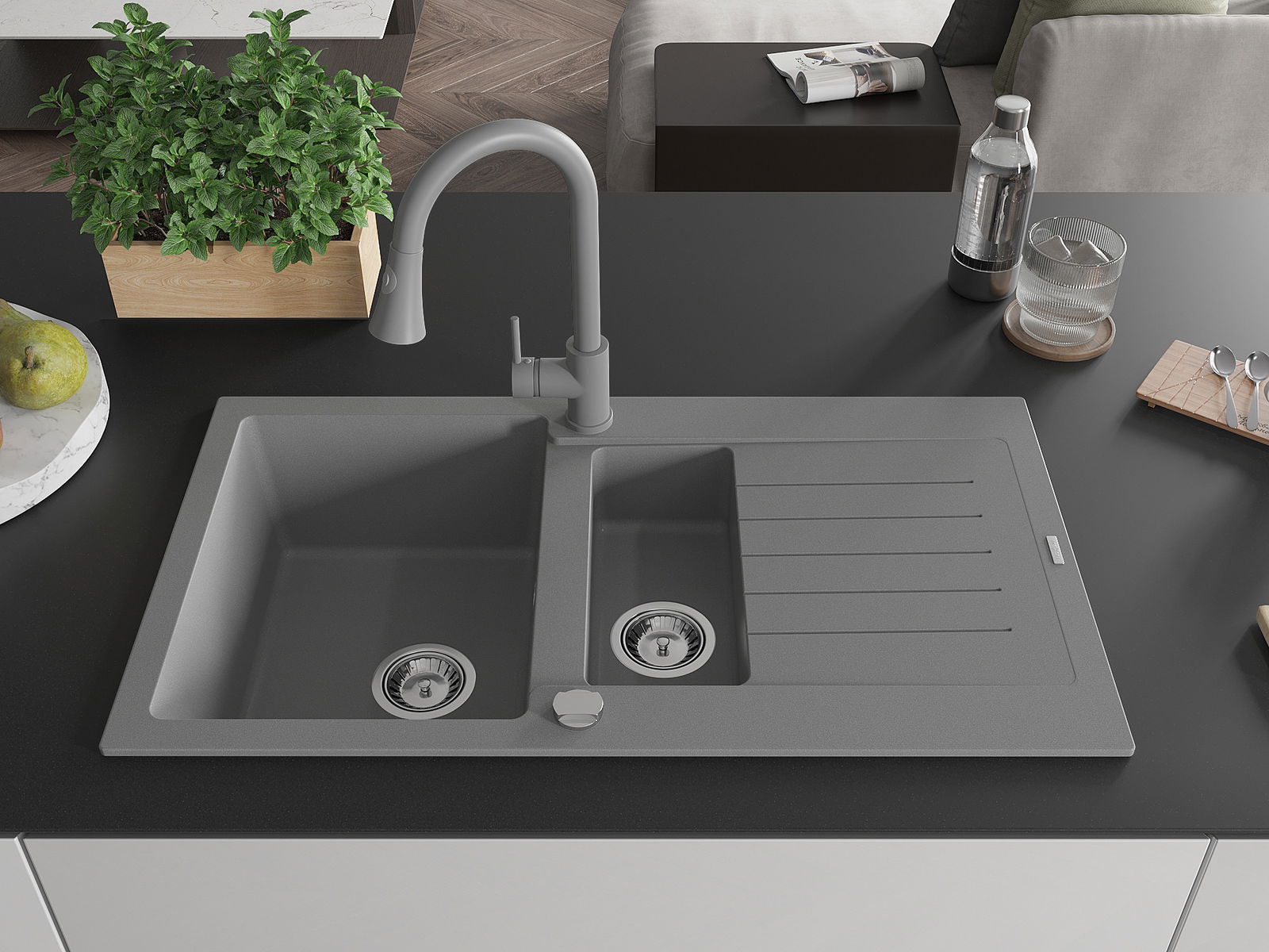 Mexen Matias granīta izlietne ar 1,5 kameru un noteku un virtuves krānu Elia, pelēka - 6502-71-670101-71