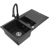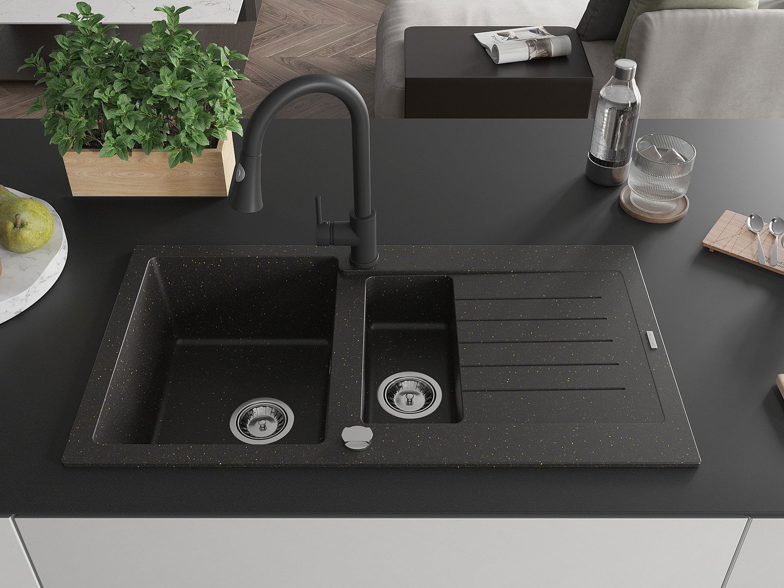 Mexen Matias granīta izlietne ar 1,5 nodalījumiem, ar notecētāju un virtuves jaucējkrānu Elia, melns/zeltains metālisks