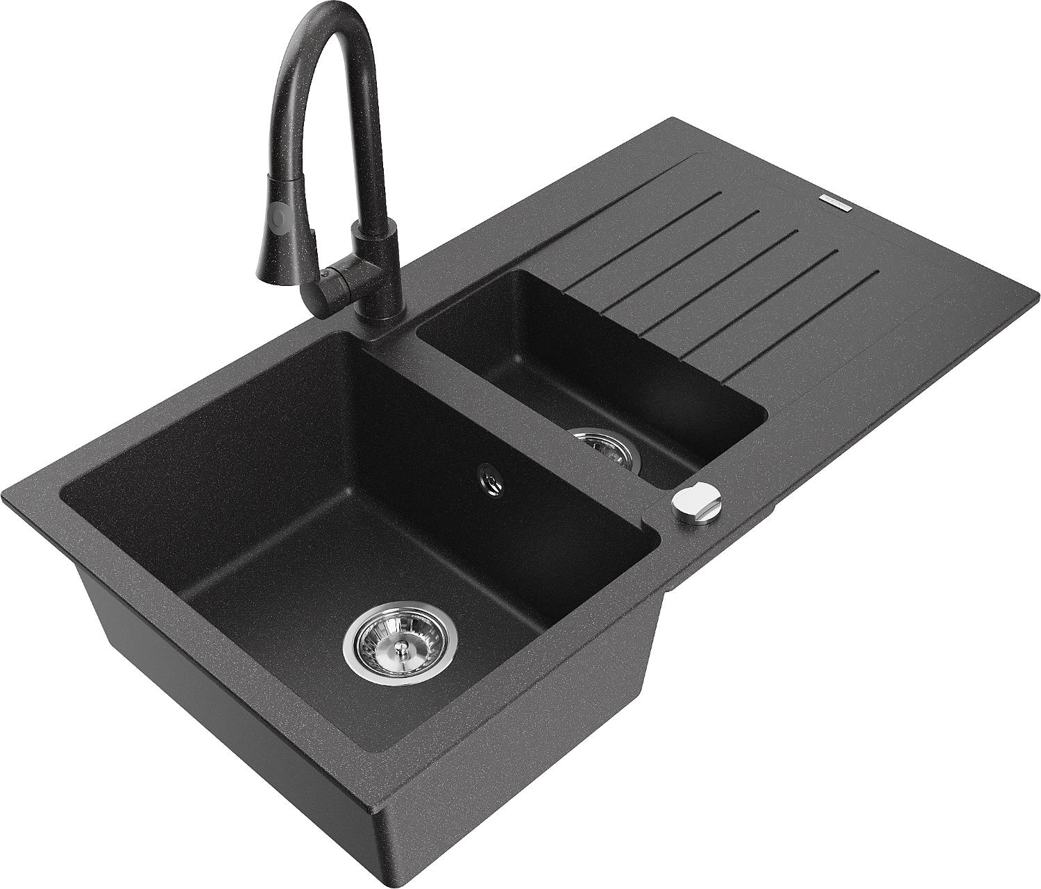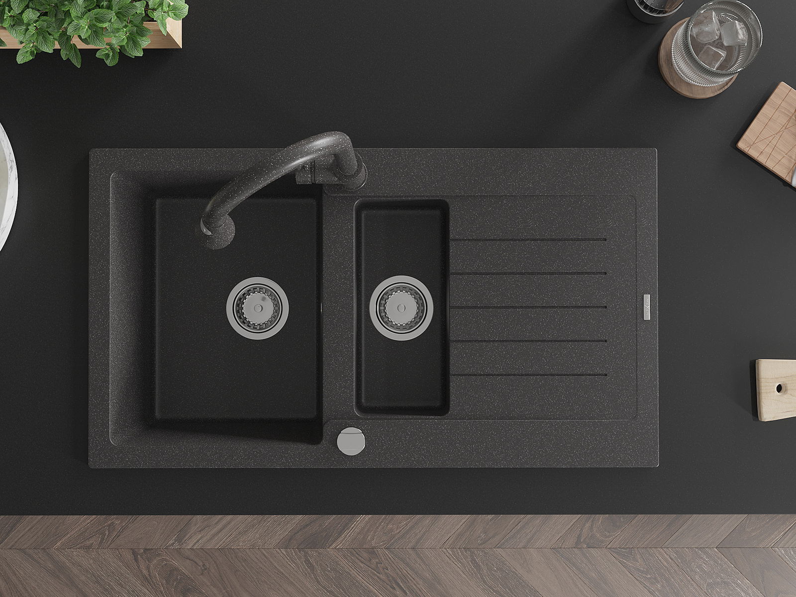 Mexen Matias granit izlietne 1,5 nodalījumu ar notecinātāju un virtuves jaucējkrānu Elia, melns punktains - 6502-76-670101-76