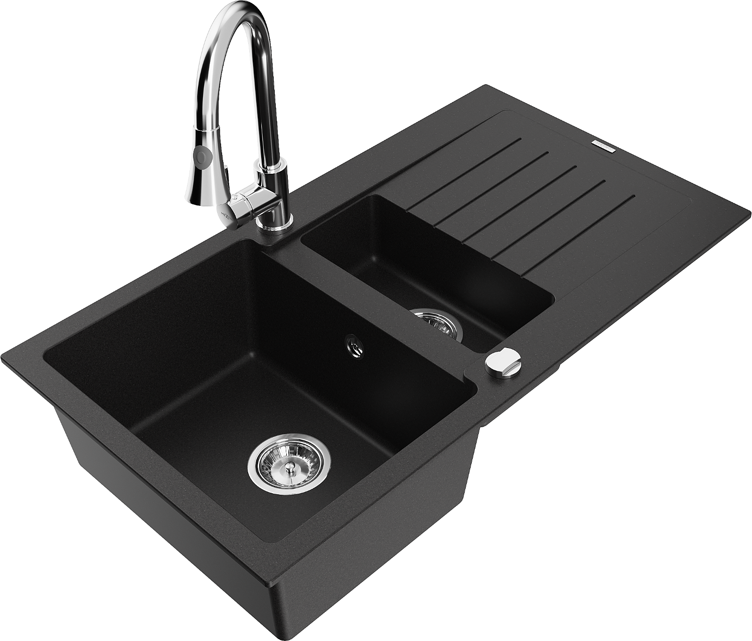 Mexen Matias 1,5 nodalījuma granīta izlietne ar noteces sistēmu un Elia virtuves jaucējkrānu, melna - 6502-77-670101-00
