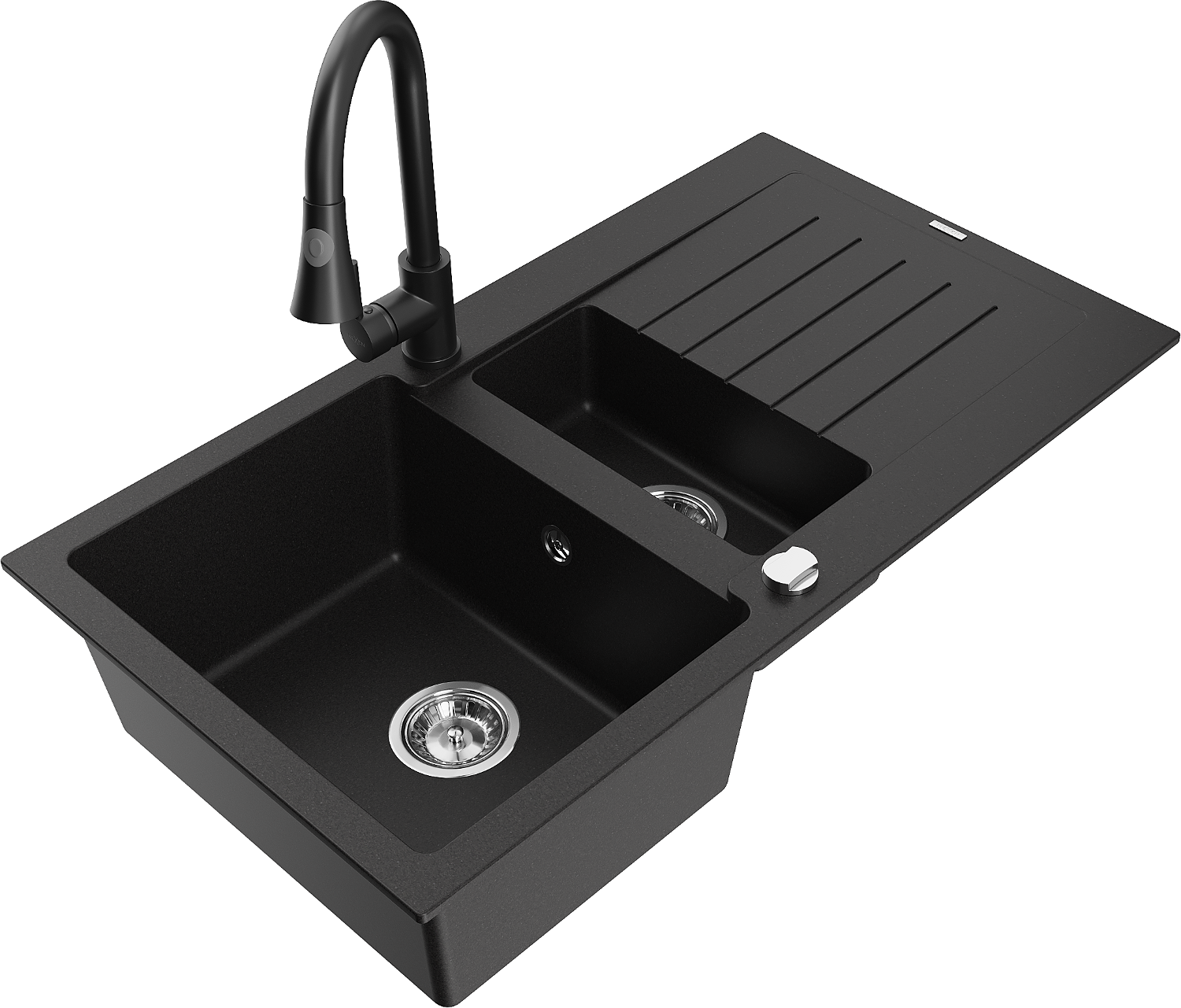 Mexen Matias granit izlietne ar 1,5 sadaļu un notecinātāju un virtuves jaucējkrānu Elia, melna - 6502-77-670101-70