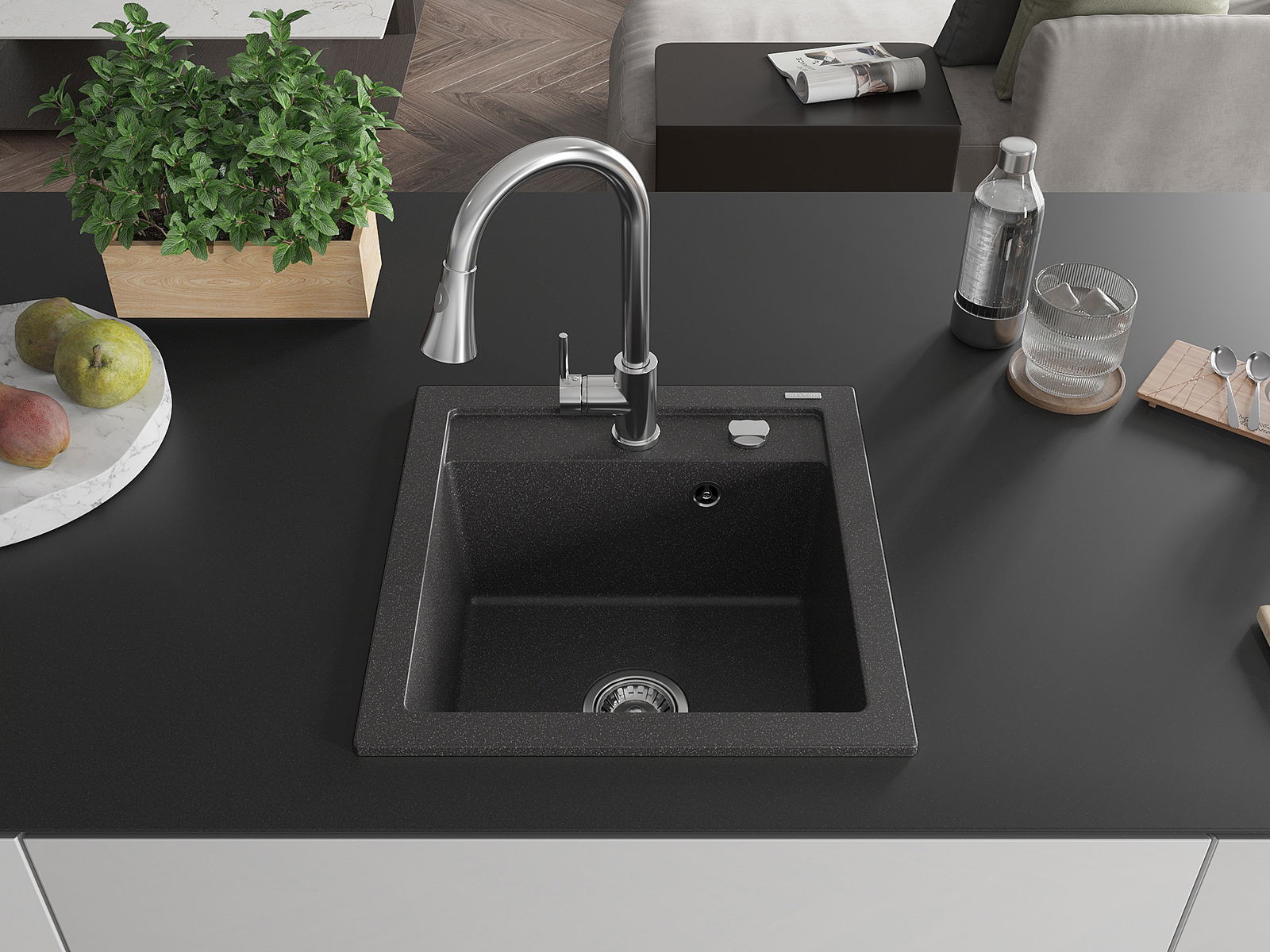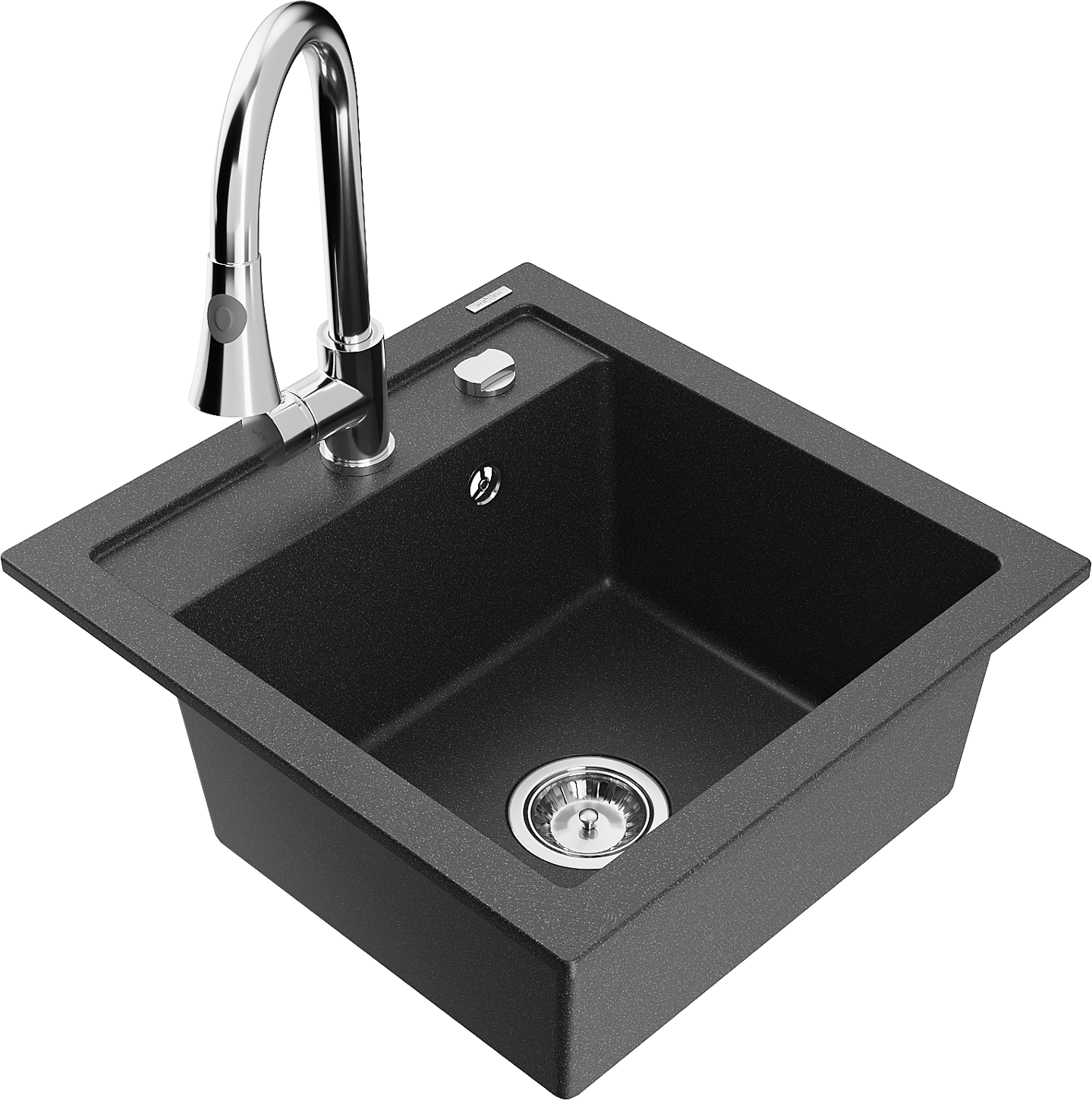 Mexen Vito granīta izlietne ar vienu nodalījumu un virtuves jaucējkrānu Elia, melna ar plankumiem - 6503-76-670101-00