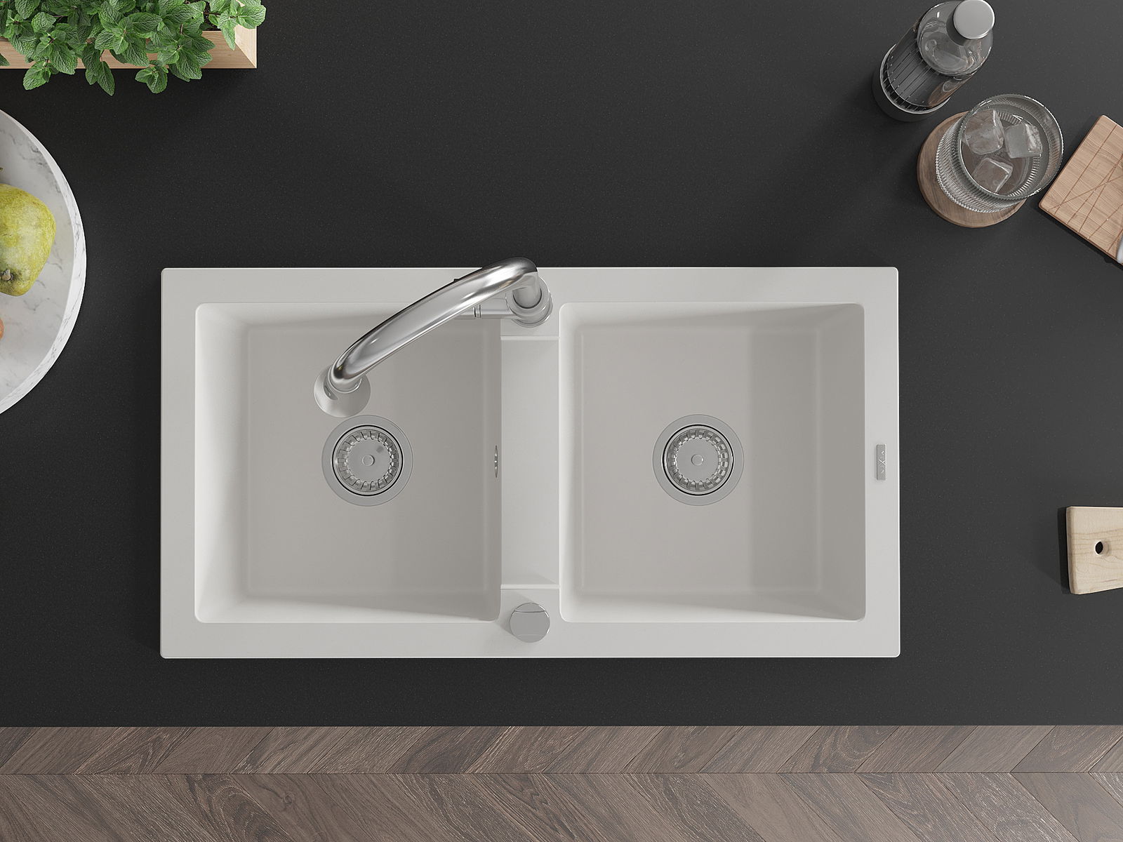 Mexen Mario divpadsmit granīta izlietne ar divām kamerām un virtuves jaucējkrānu Elia, balts - 6504-20-670101-00
