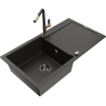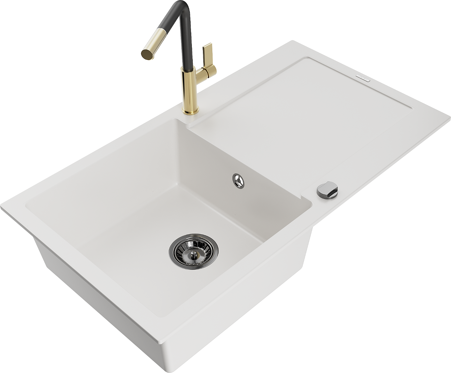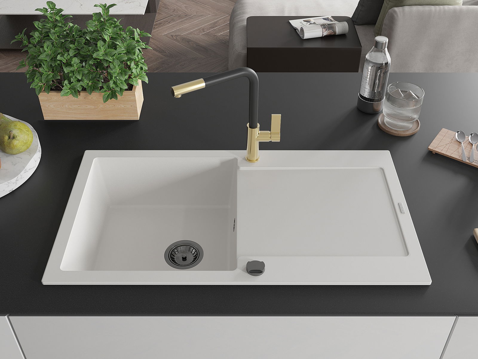 Mexen Leo granīta izlietne ar vienu nodalījumu, notecinātāju un virtuves jaucējkrānu Flora, balta - 6501-20-670401-57-B