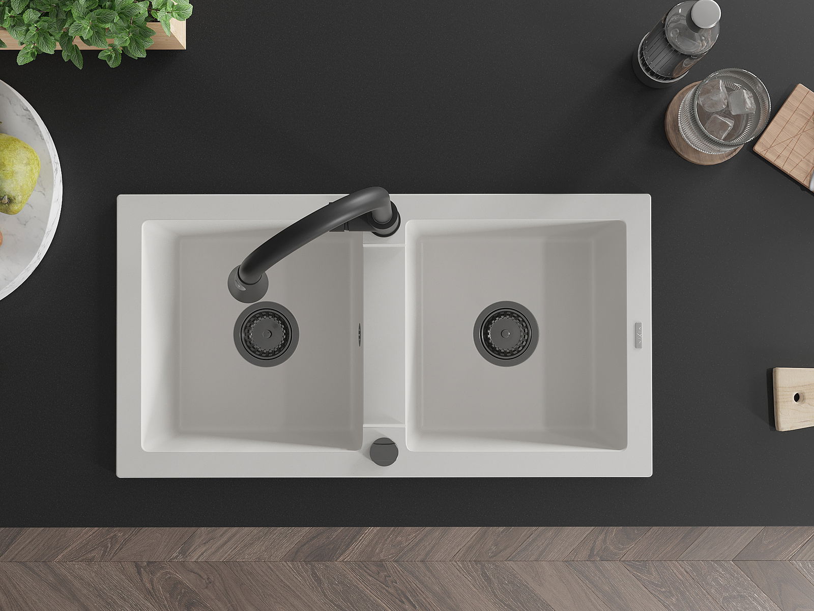 Mexen Mario granitā izlietne ar 2 nodalījumiem un virtuvēm jaucējkrānu Elia, balta - 6504-20-670101-70