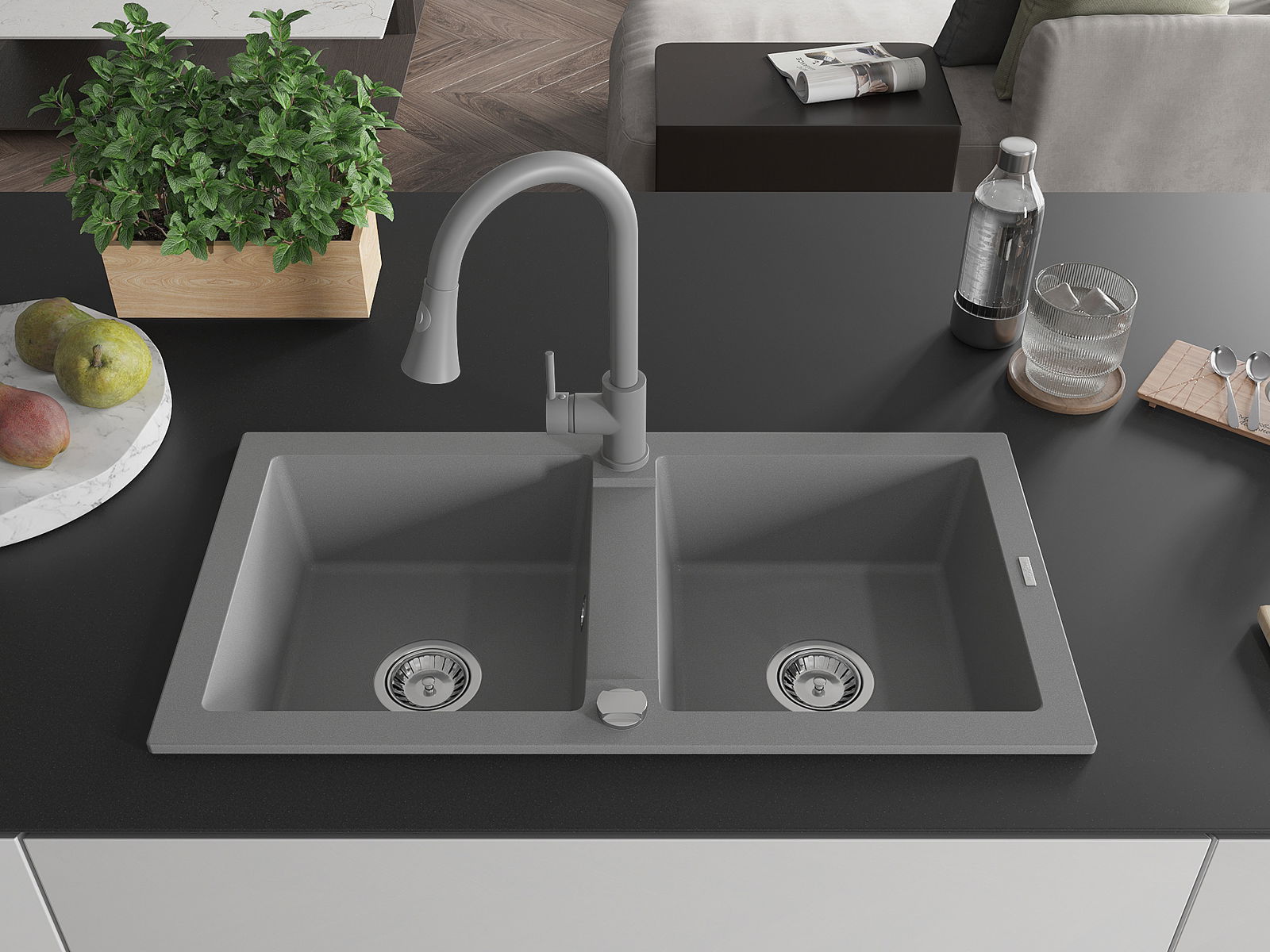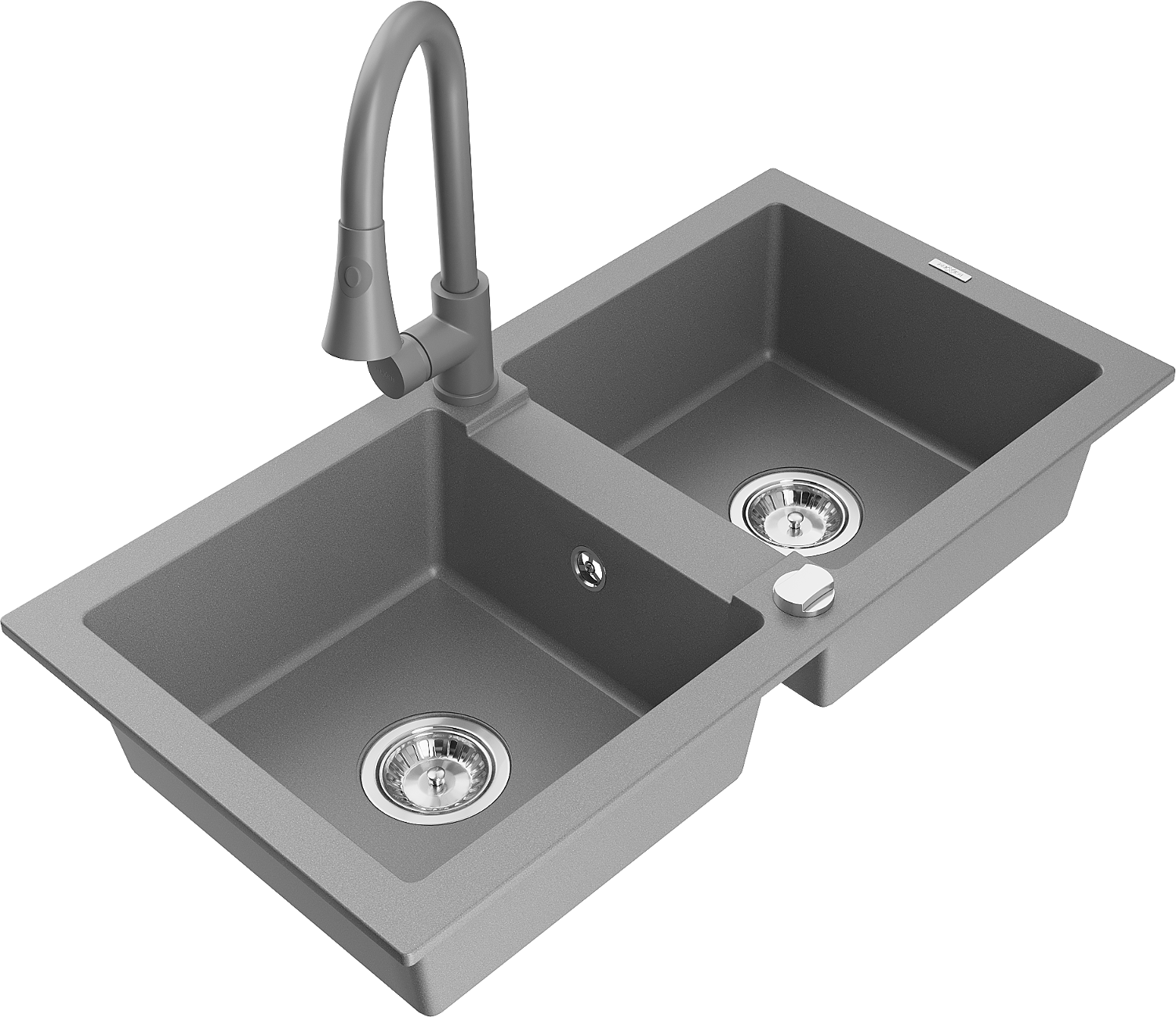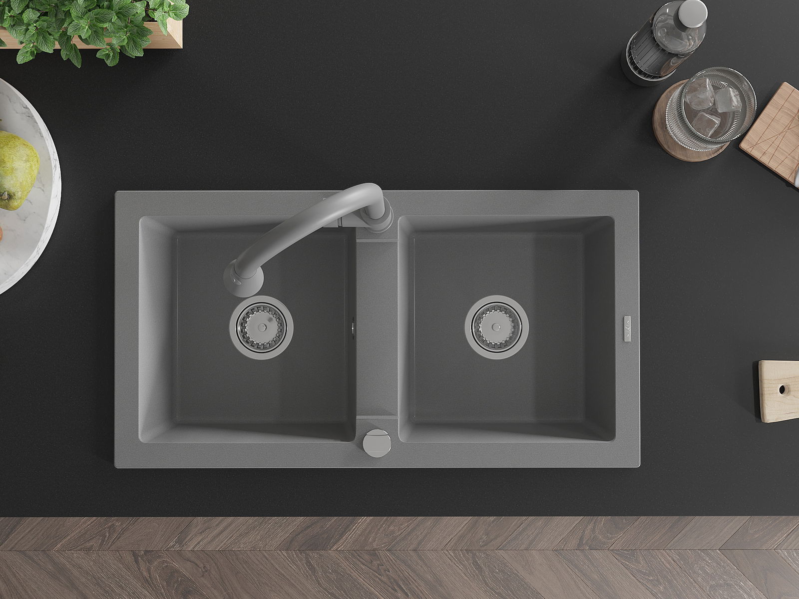 Mexen Mario 2 nodalījumu granīta izlietne ar virtuves jaucējkrānu Elia, pelēka - 6504-71-670101-71