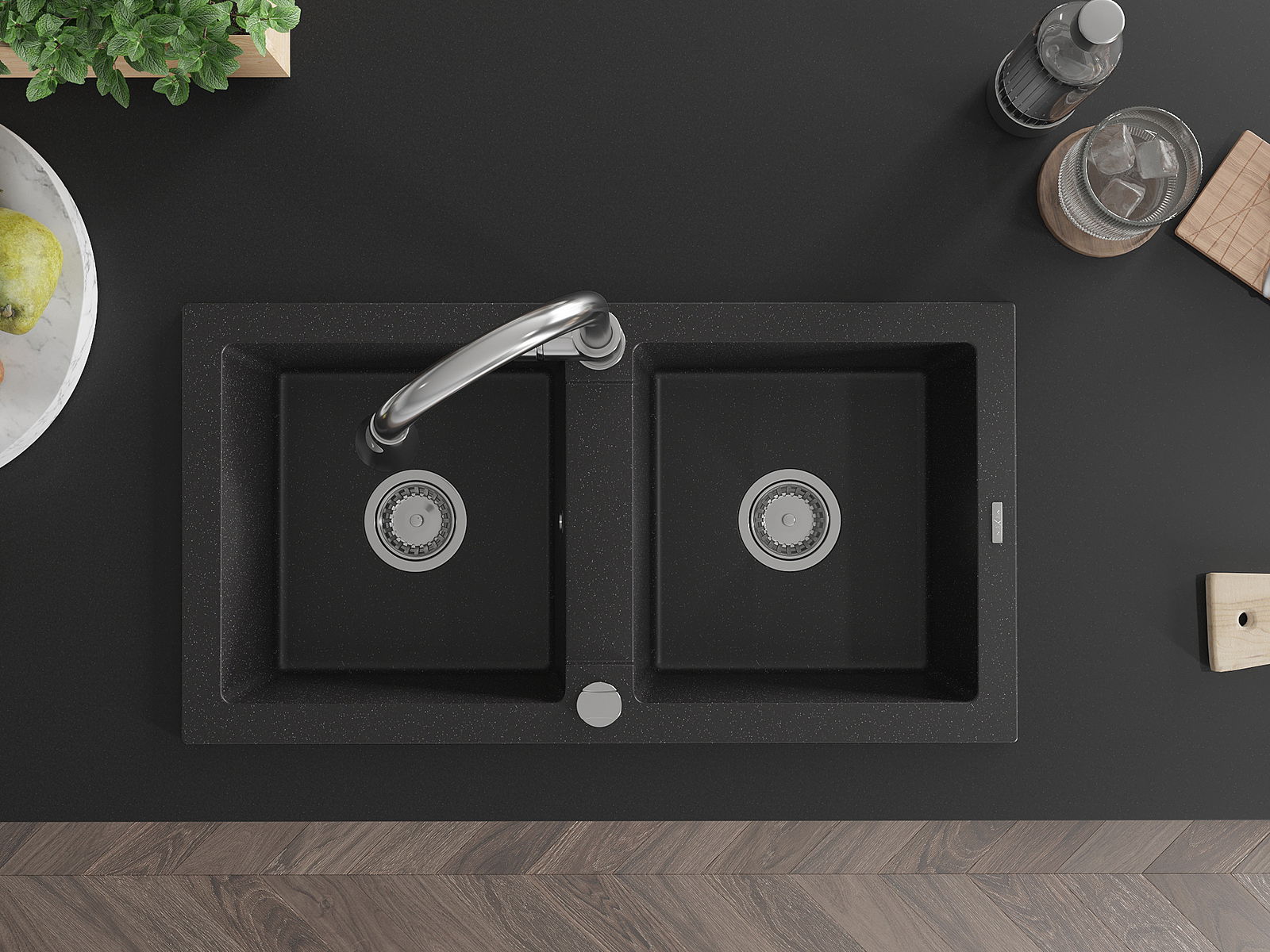 Mexen Mario granitizlietne ar 2 nodalījumiem ar virtuves krānu Elia, melna/sudraba metālika - 6504-73-670101-00