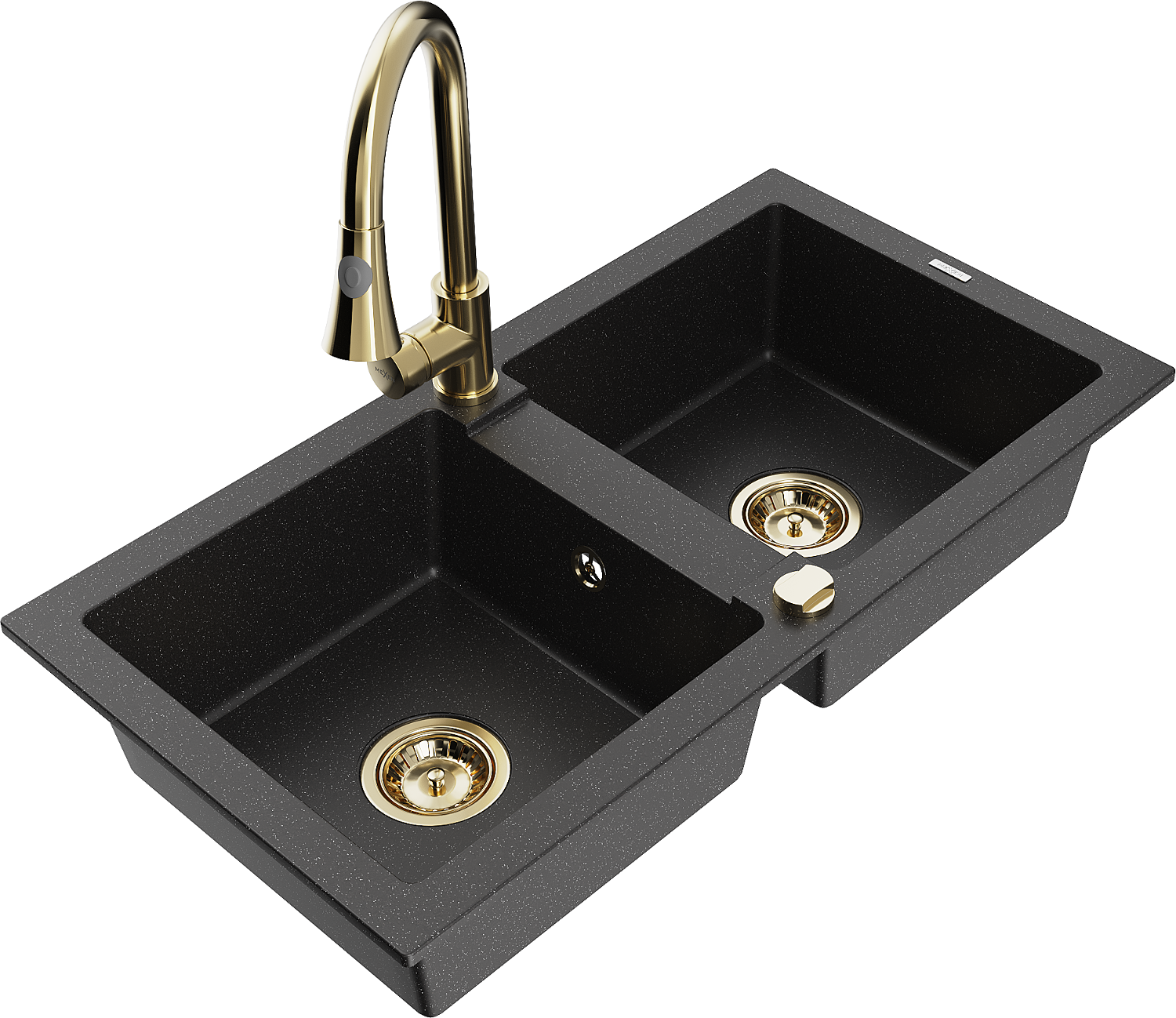 Mexen Mario granit izlietne ar 2 nodalījumiem un virtuves jaucējkrānu Elia, melns/sudraba metālika - 6504-73-670101-50