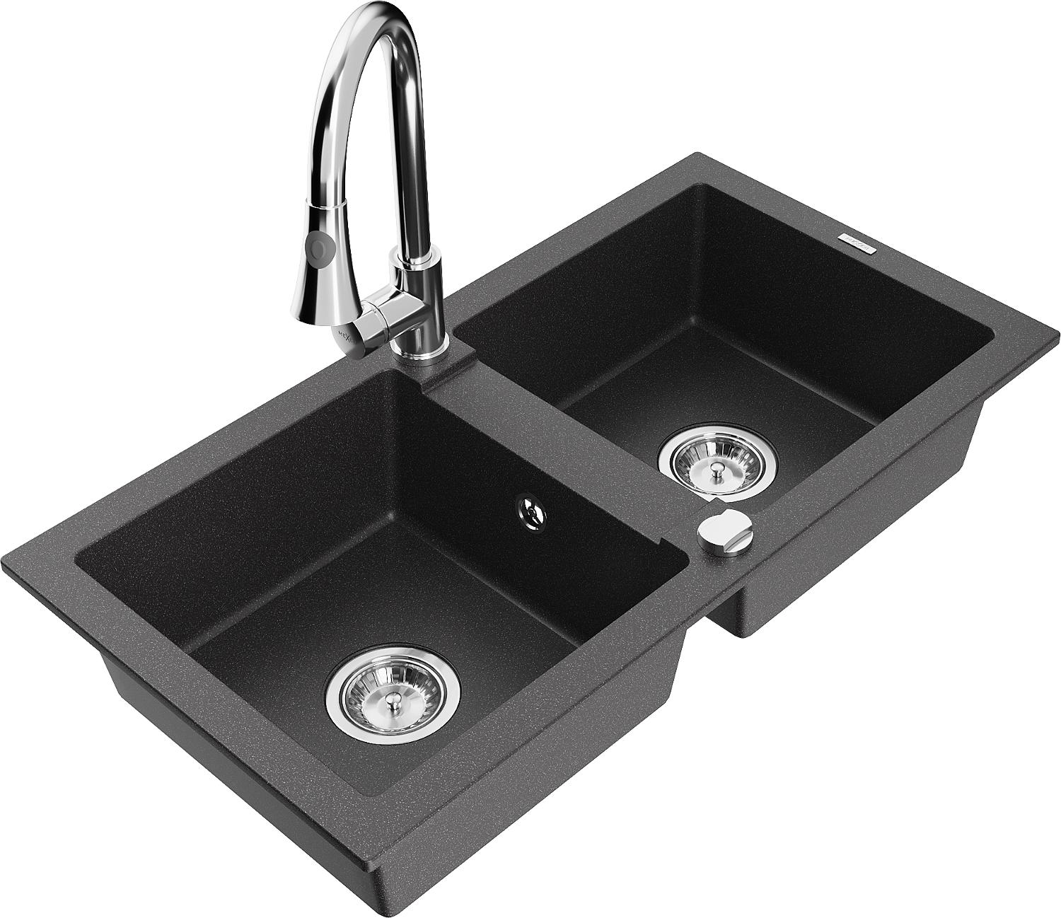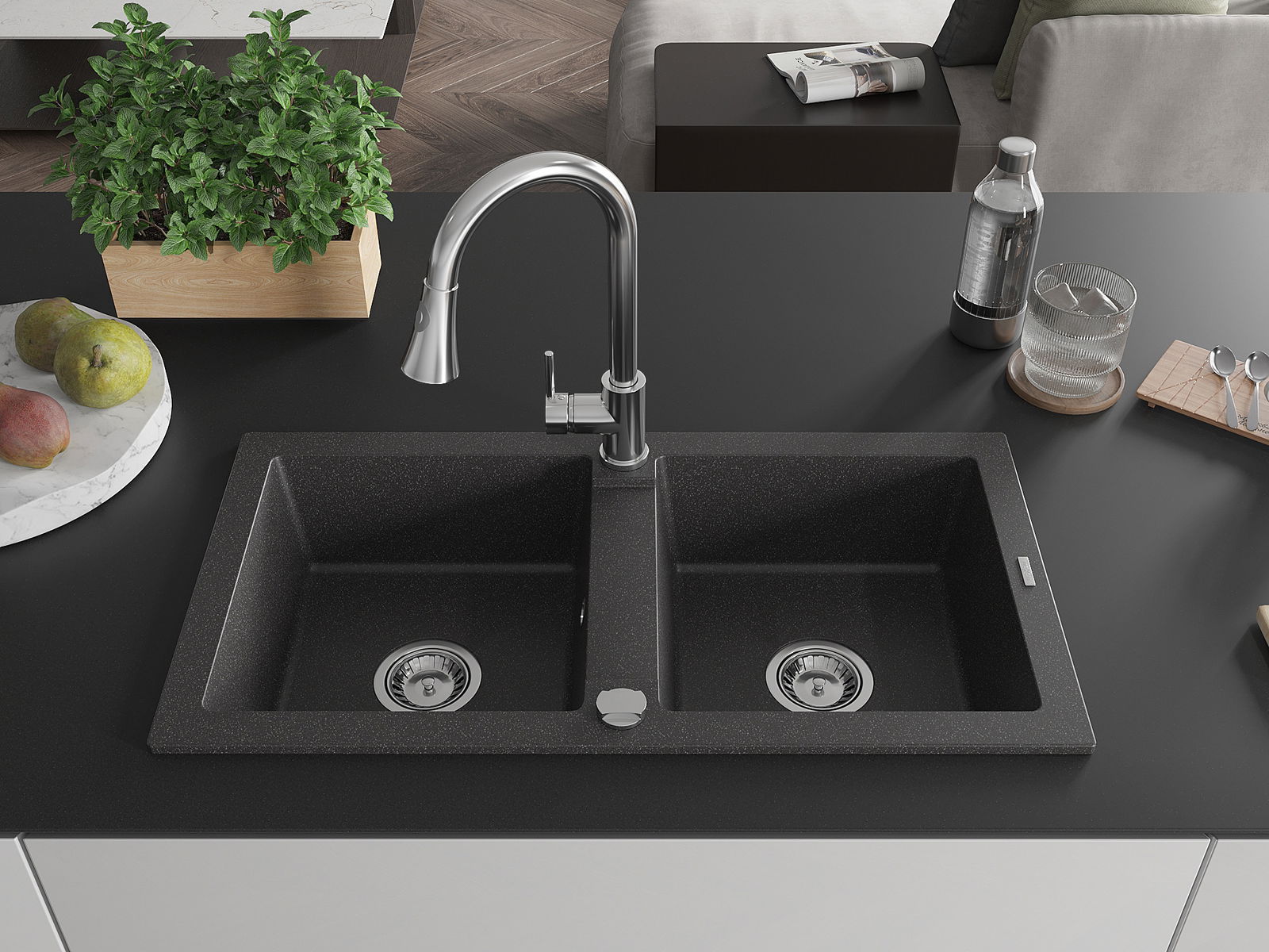 Mexen Mario granīta virtuves izlietne ar divām nodalījumiem un Elia krānu, melna ar punktiem - 6504-76-670101-00