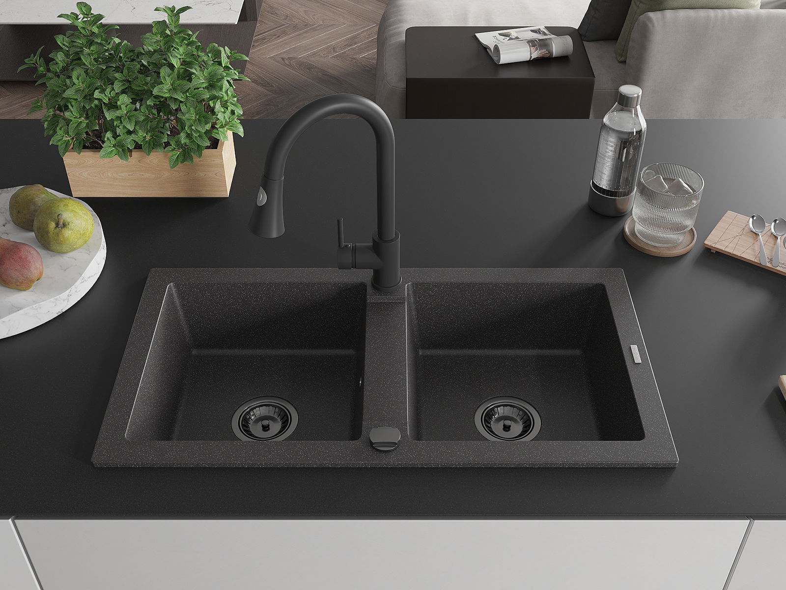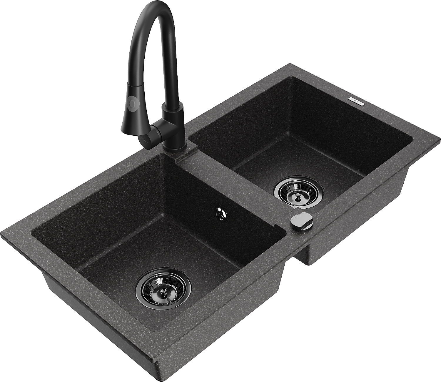 Mexen Mario Divu nodalījumu granīta izlietne ar virtuves jaucējkrānu Elia, melna ar ieskicējumiem - 6504-76-670101-70-B