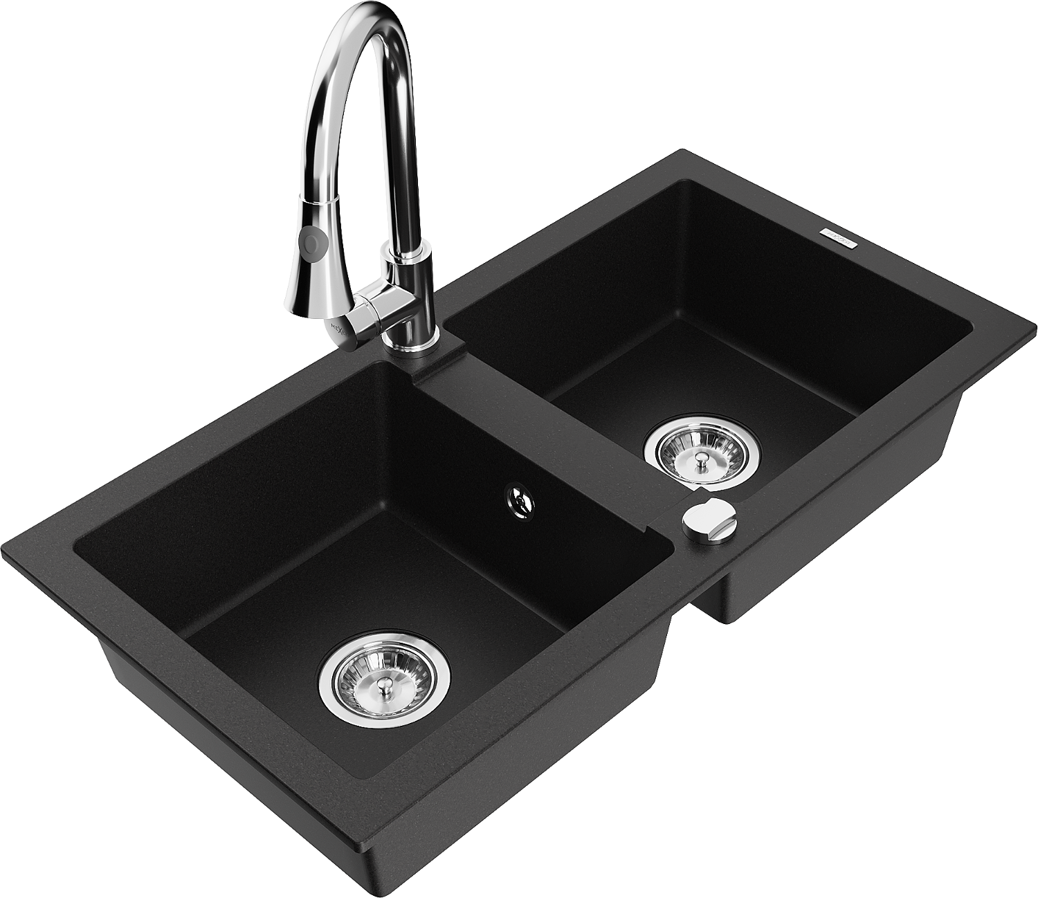 Mexen Mario divu nodalījumu granīta izlietne ar virtuves jaucējkrānu Elia, melna - 6504-77-670101-00