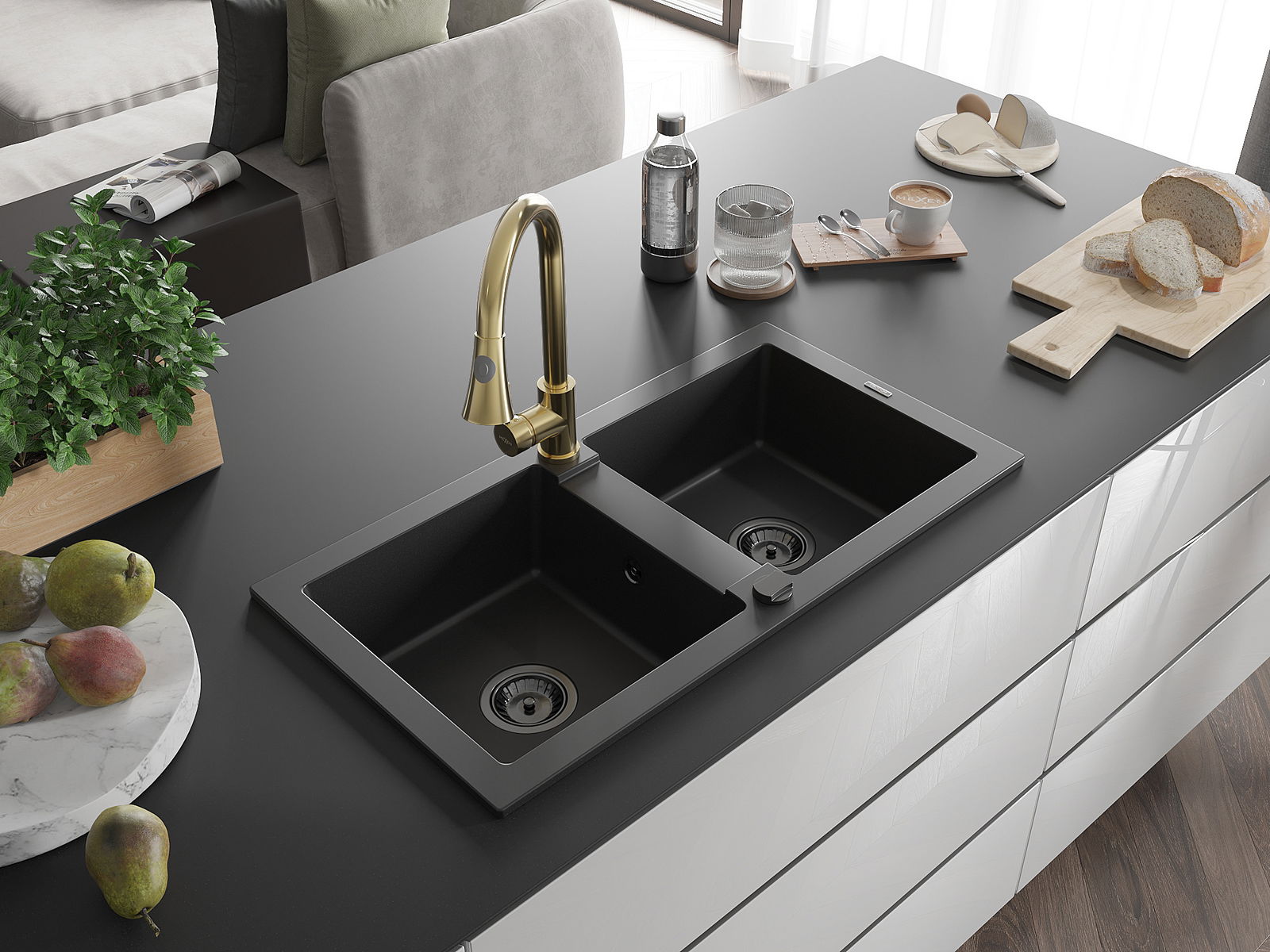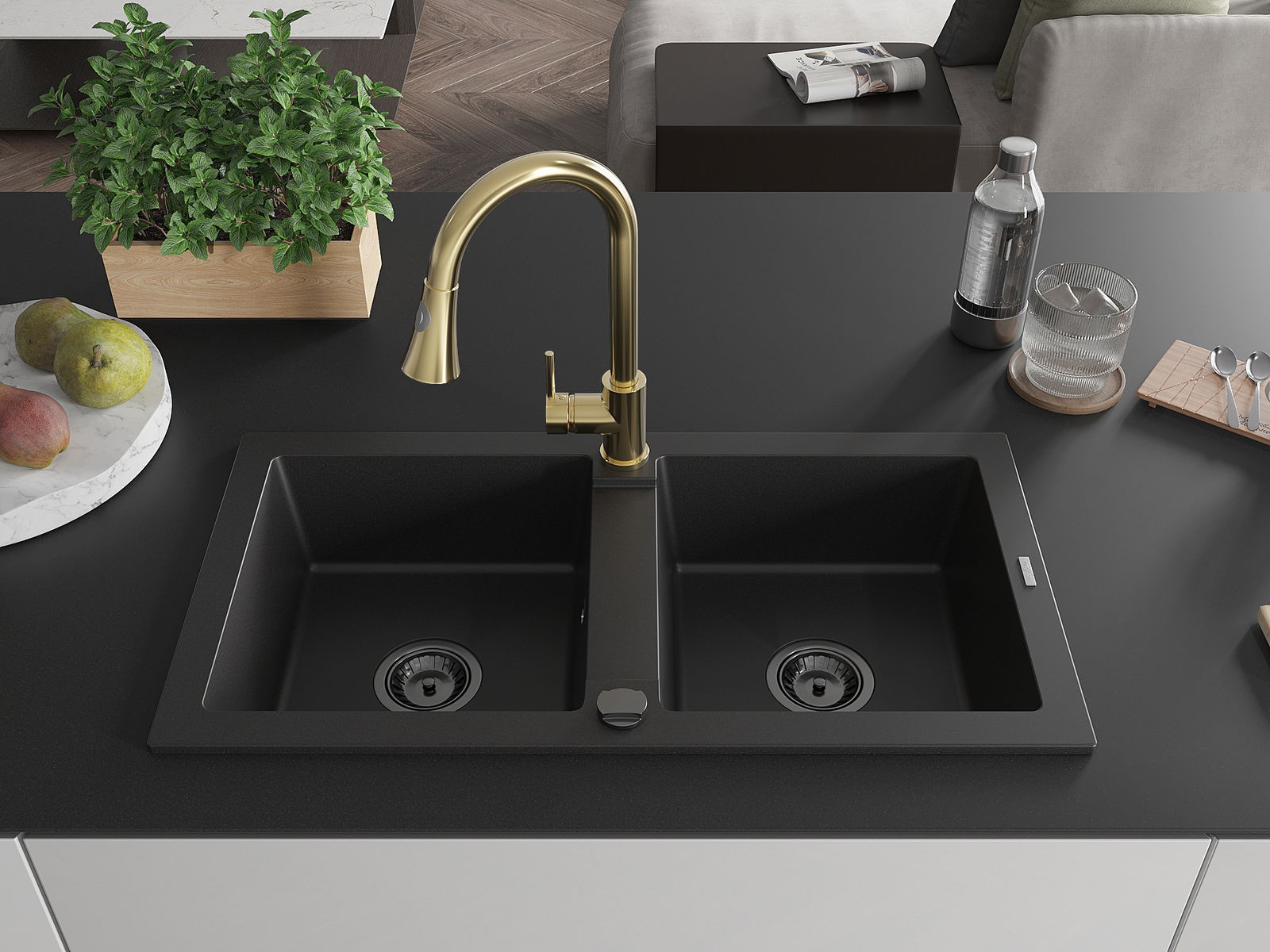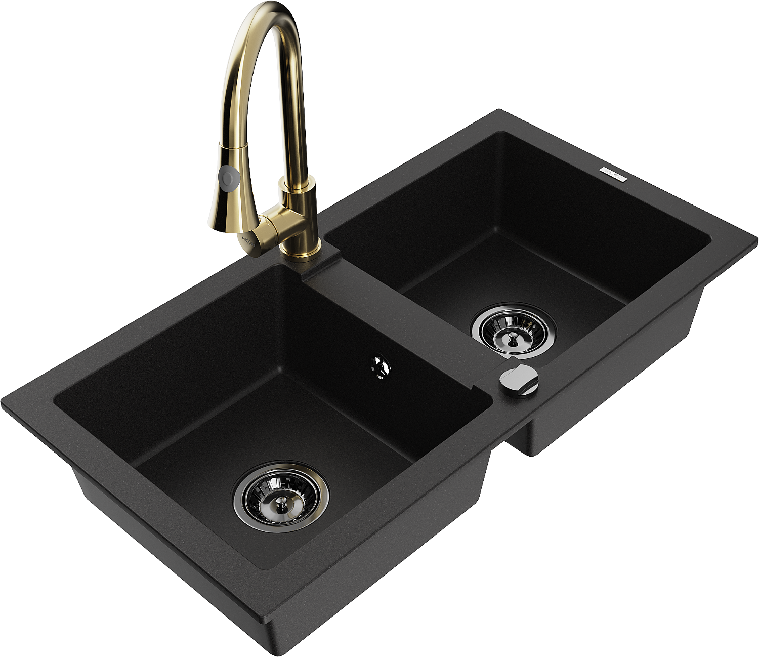Mexen Mario granīta izlietne ar divām kamerām un virtuves jaucējkrānu Elia, melna - 6504-77-670101-50-B