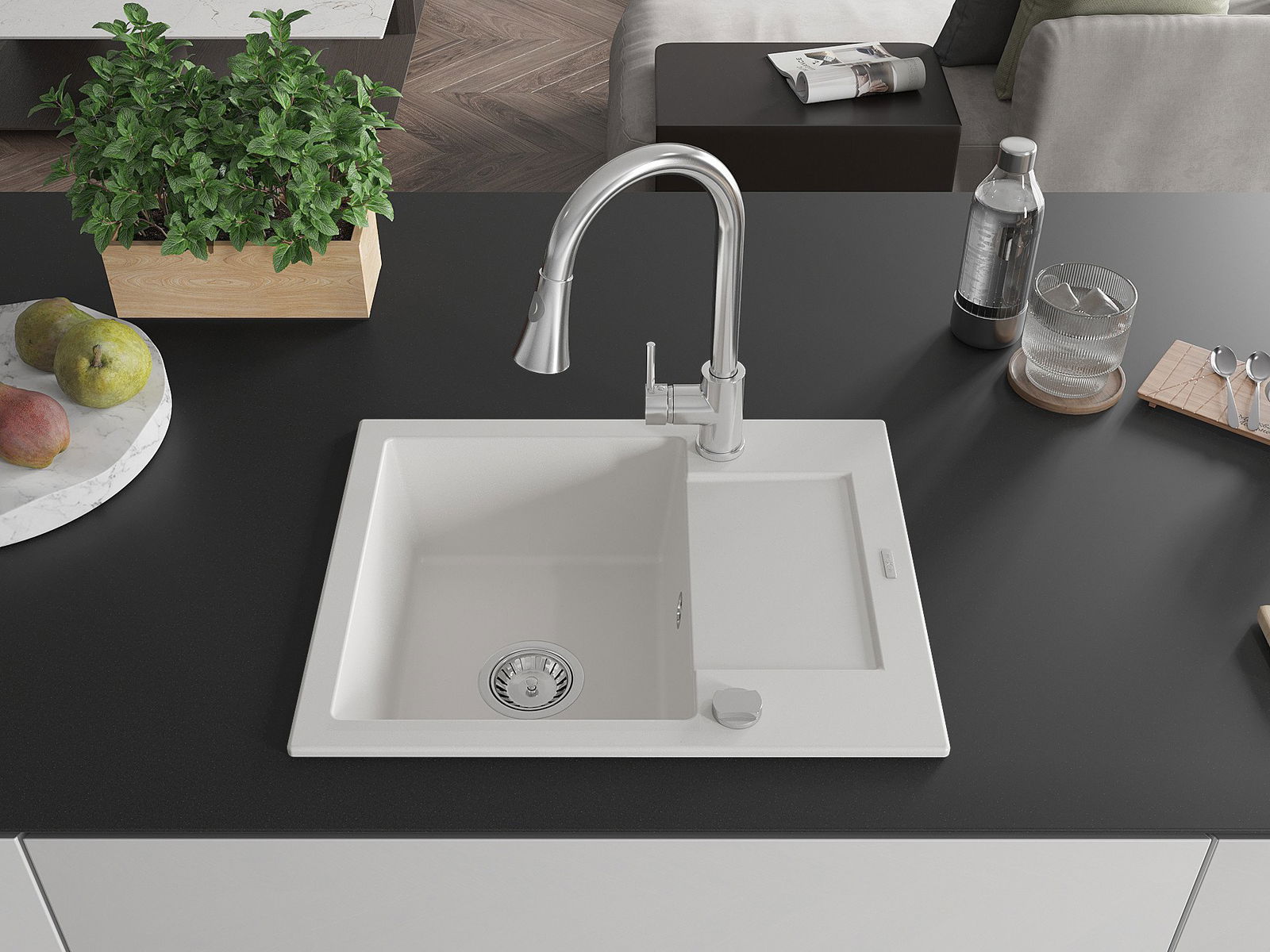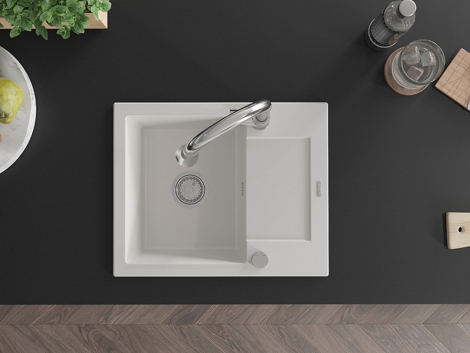 Mexen Enzo granitais izlietne ar 1 nodalījumu, noteku un virtuves jaucējkrānu Elia, balta - 6506-20-670101-00
