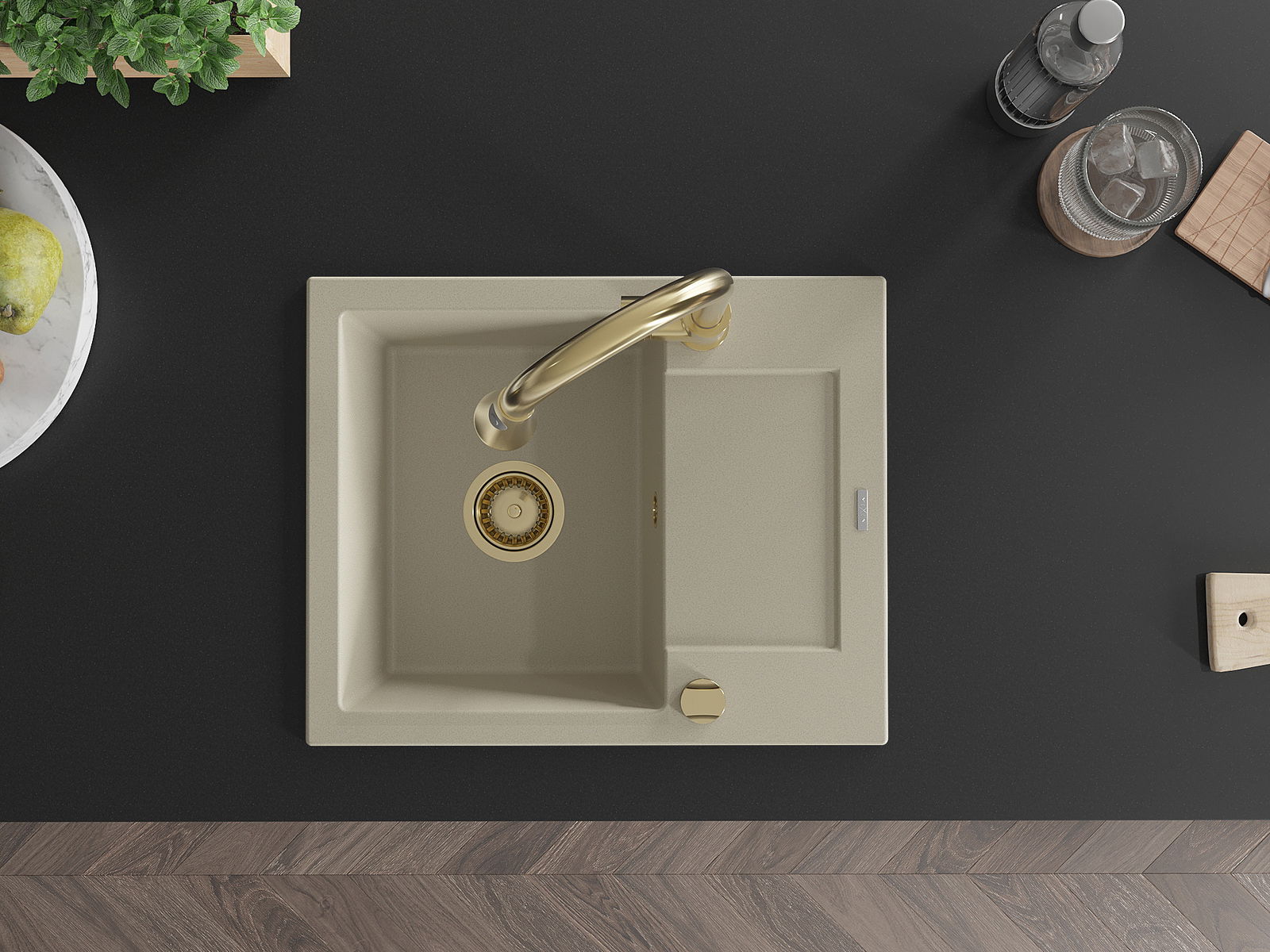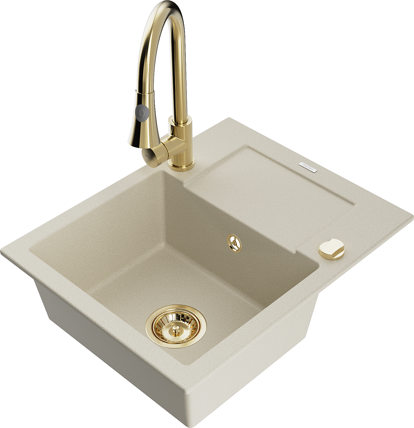 Mexen Enzo granit izlietne ar 1 nodalījumu, notekpaplāti un virtuves jaucējkrānu Elia, bēšs - 6506-69-670101-50