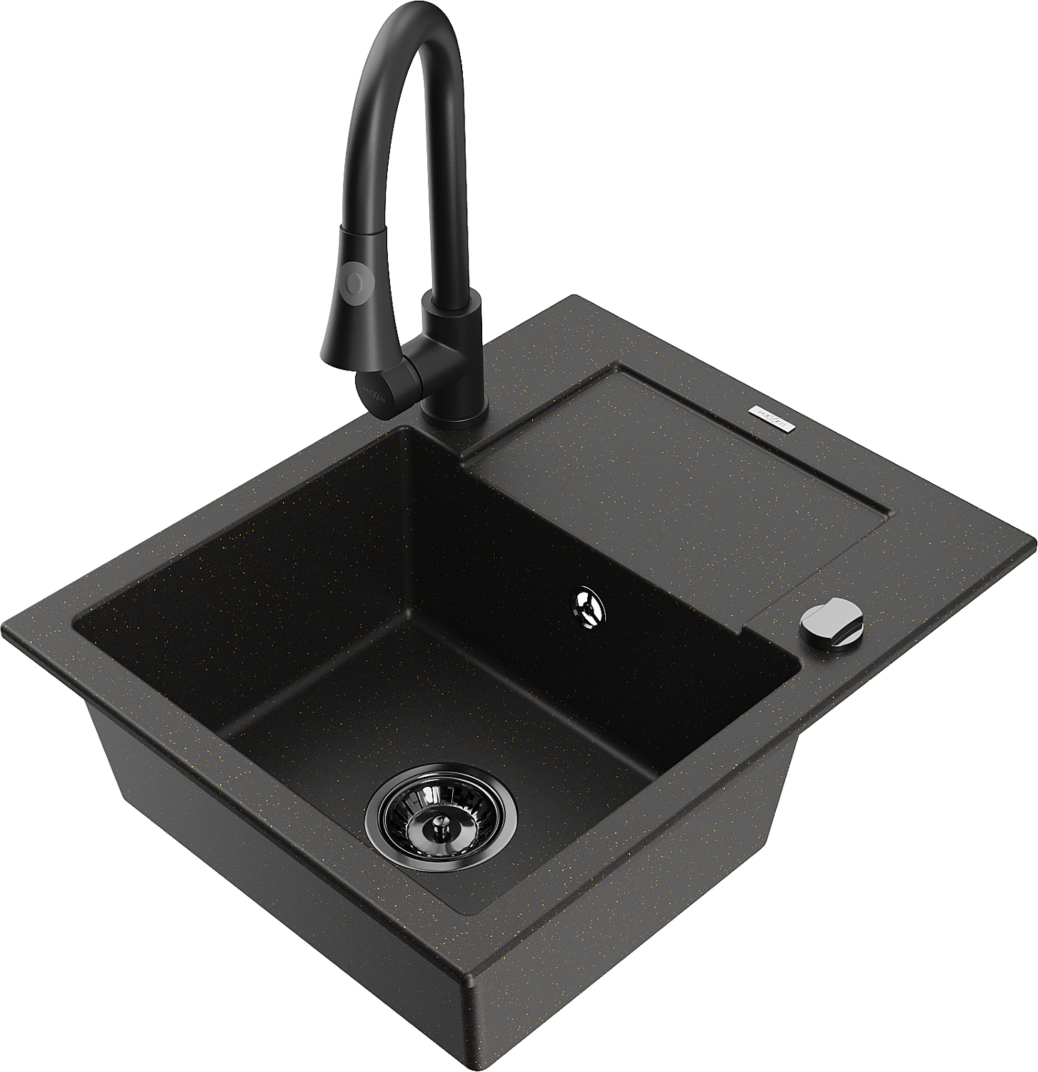 Mexen Enzo grants izlietne ar vienu nodalījumu, noteces virsmu un virtuves jaucējkrānu Elia, melns/zeltīts metālisks