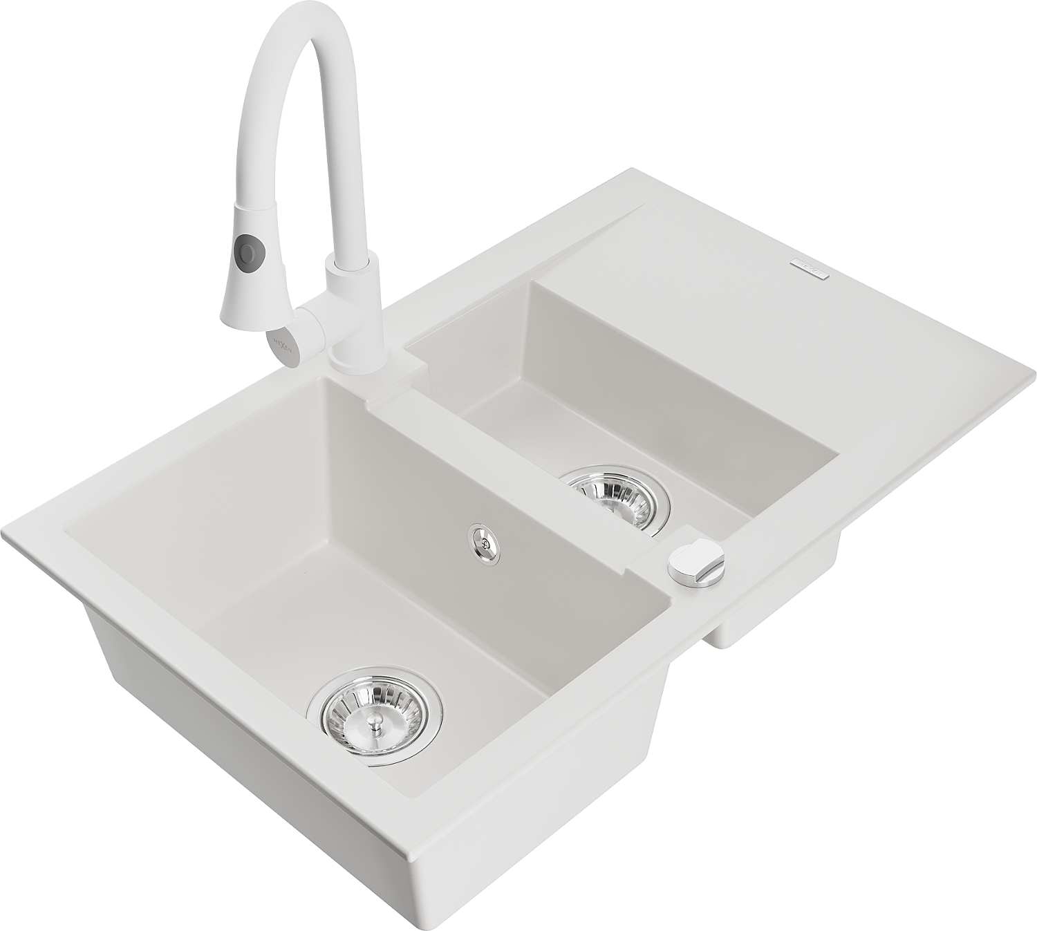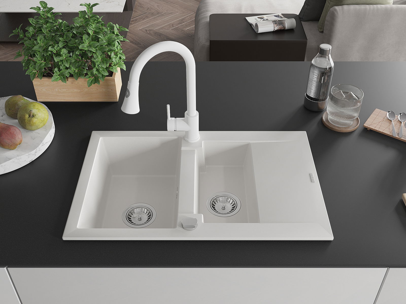 Mexen Gaspar granitē izlietne ar 1,5 nodalījumu un noteku un virtuves jaucējkrānu Elia, balts - 6507-20-670101-20