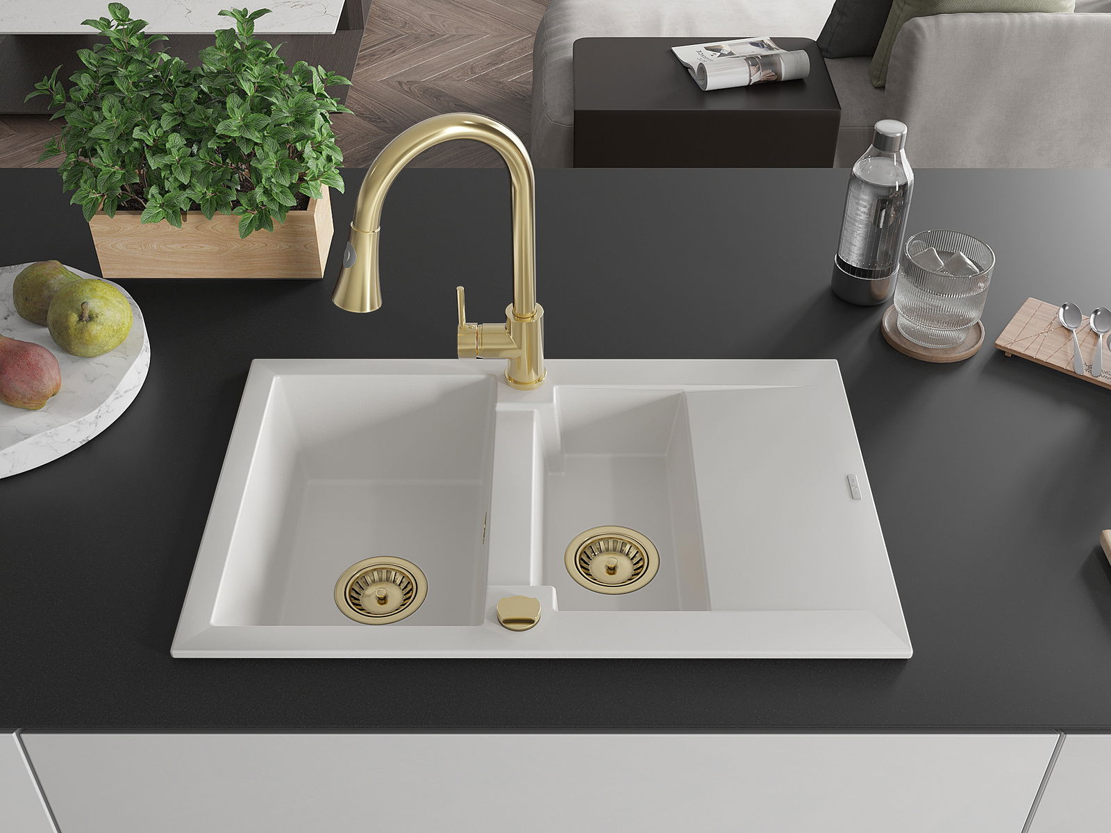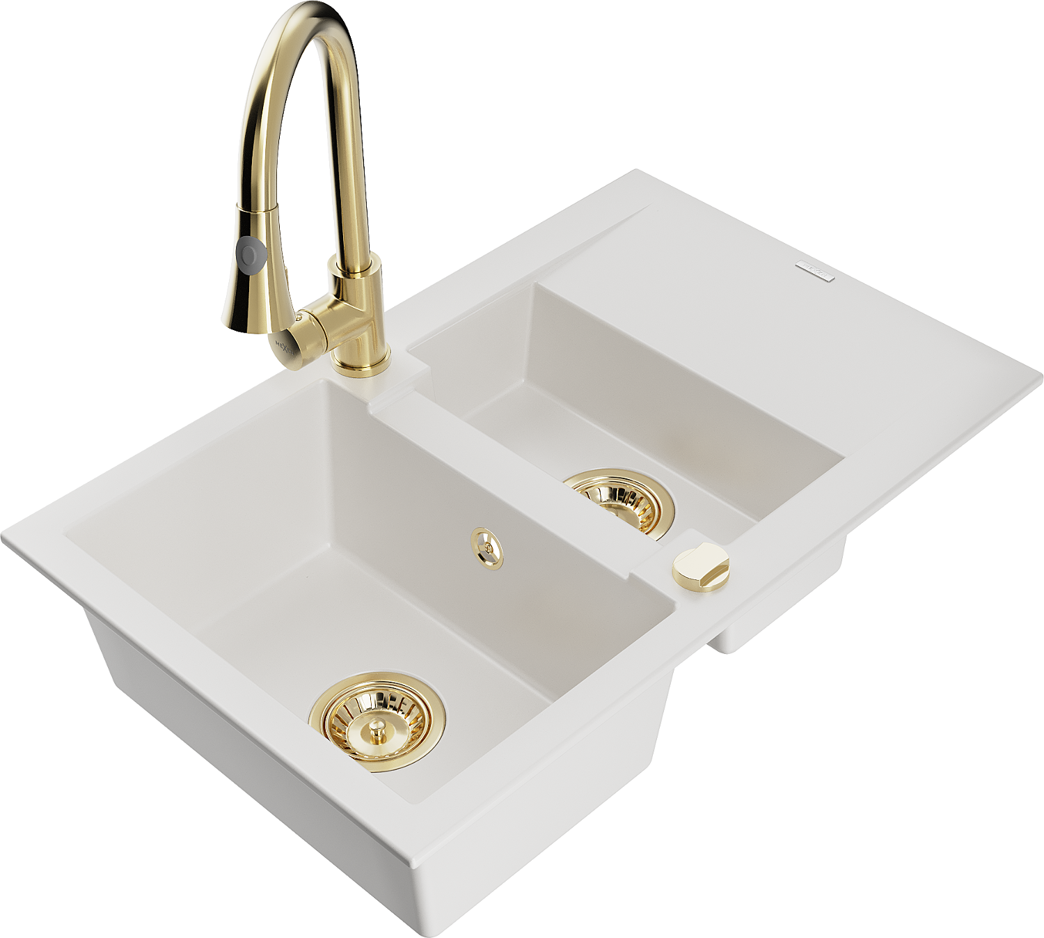 Mexen Gaspar granitā izlietne 1,5 nodalījums ar notecētāju un virtuves jaucējkrānu Elia, balts - 6507-20-670101-50