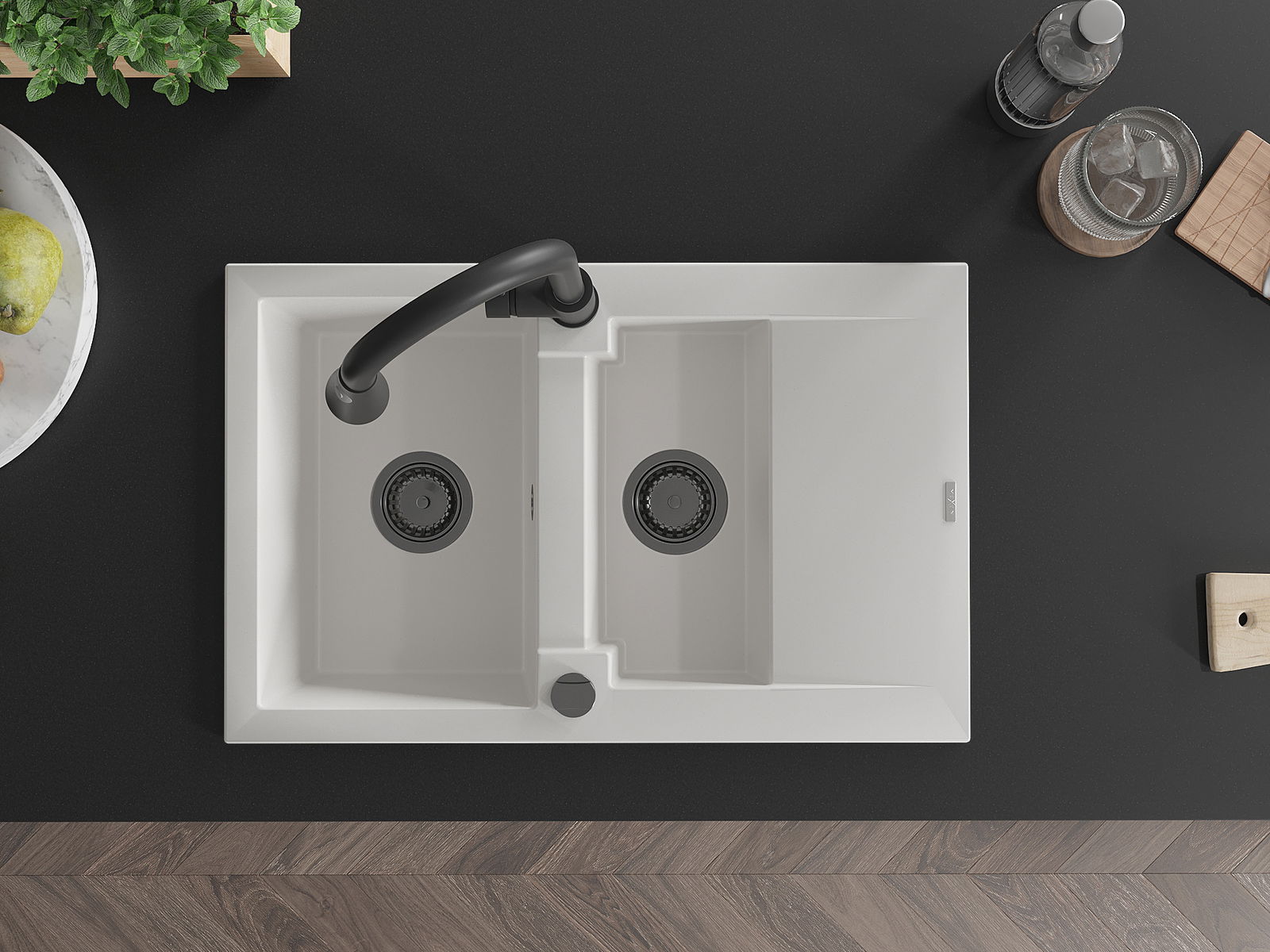 Mexen Gaspar Granitā izlietne ar 1,5 nodalījumu, notecināšanas plāksni un virtuves krānu Elia, balta - 6507-20-670101-70