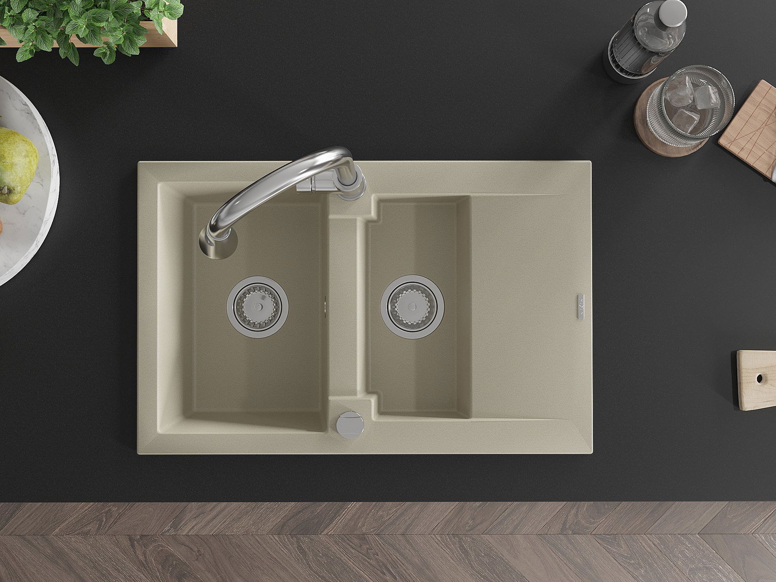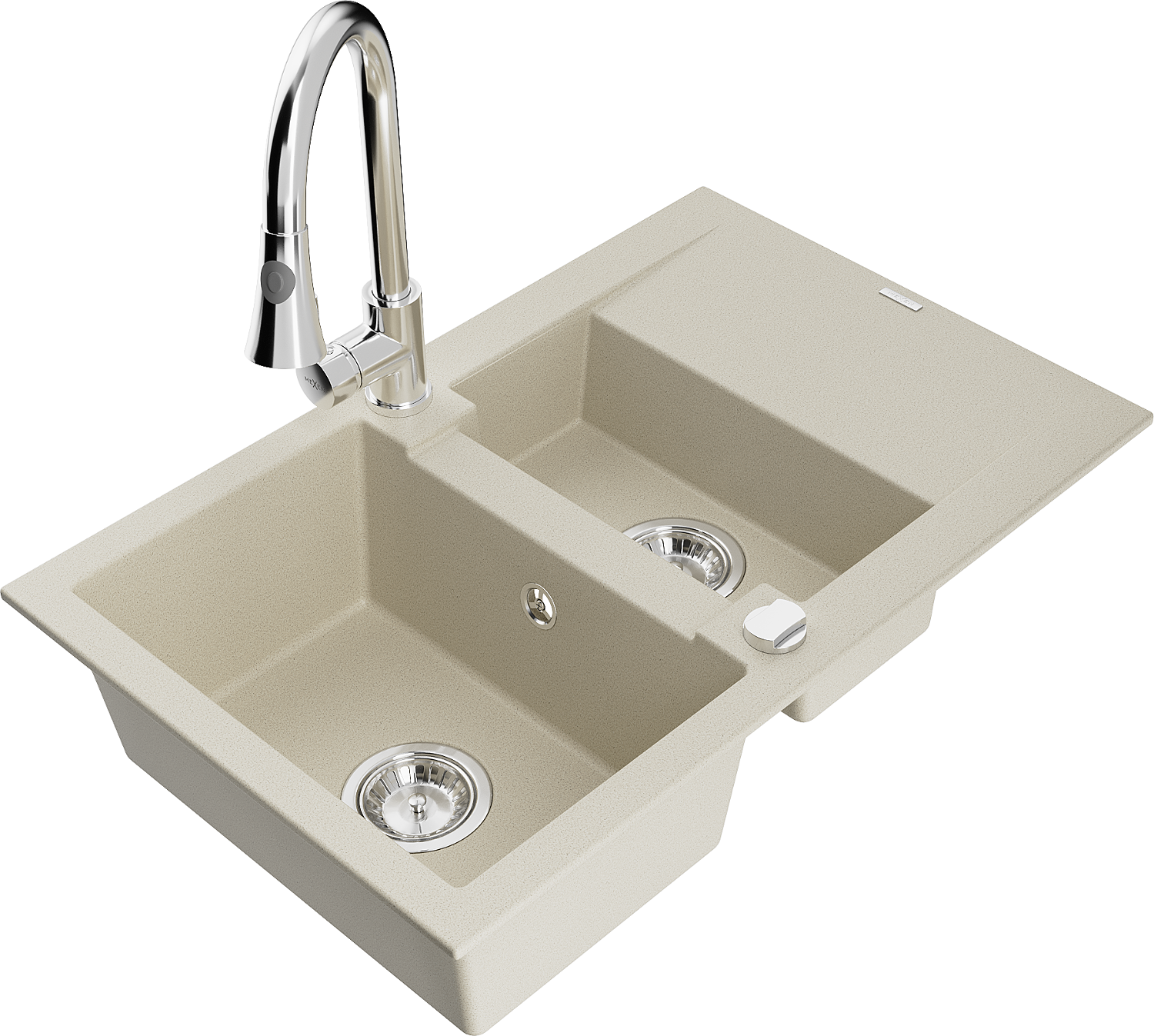 Mexen Gaspar granitais izlietne ar 1,5 nodalījumiem, noteces daļu un virtuves krānu Elia, bēša - 6507-69-670101-00