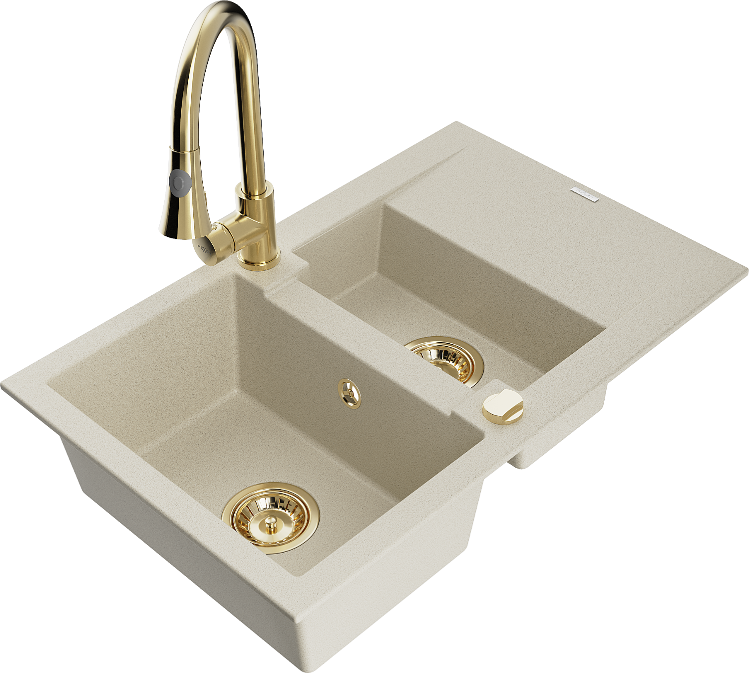 Mexen Gaspar granīta izlietne ar 1,5 nodalījumiem un noteces plauktu un virtuves jaucējkrānu Elia, bēša - 6507-69-670101-50