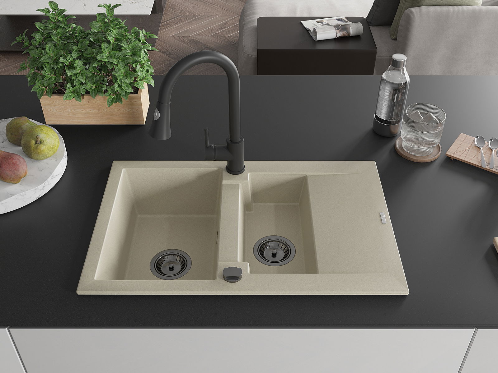 Mexen Gaspar Granitā izlietne ar 1,5 nodalījumu, notecinātāju un virtuves jaucējkrānu Elia, bēša - 6507-69-670101-70